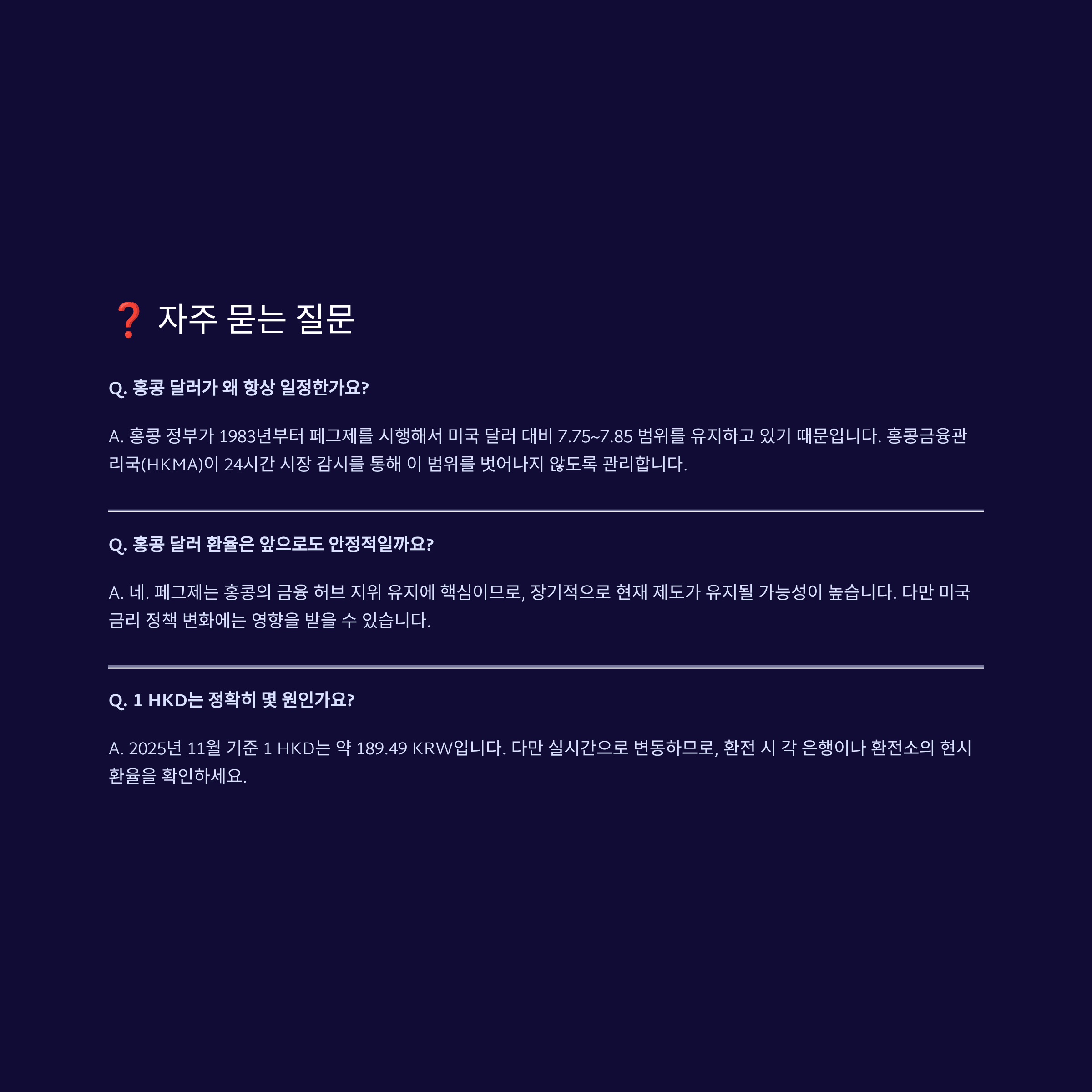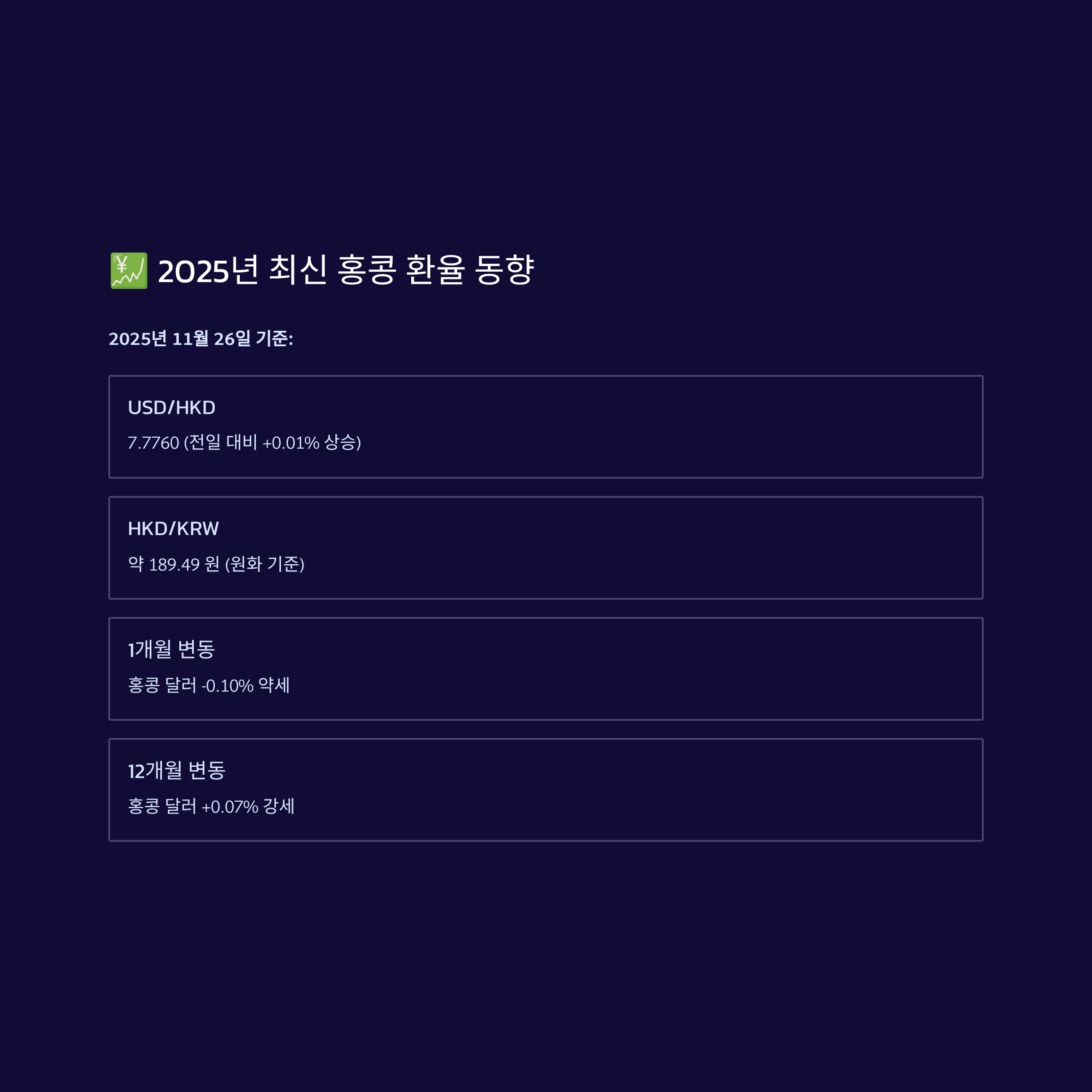 2025년 11월 현재 1 USD = 7.7760 HKD의 고정환율을 유지하고 있으며, 이는 1983년부터 시작된 페그제(페그드 환율 제도) 덕분입니다.
