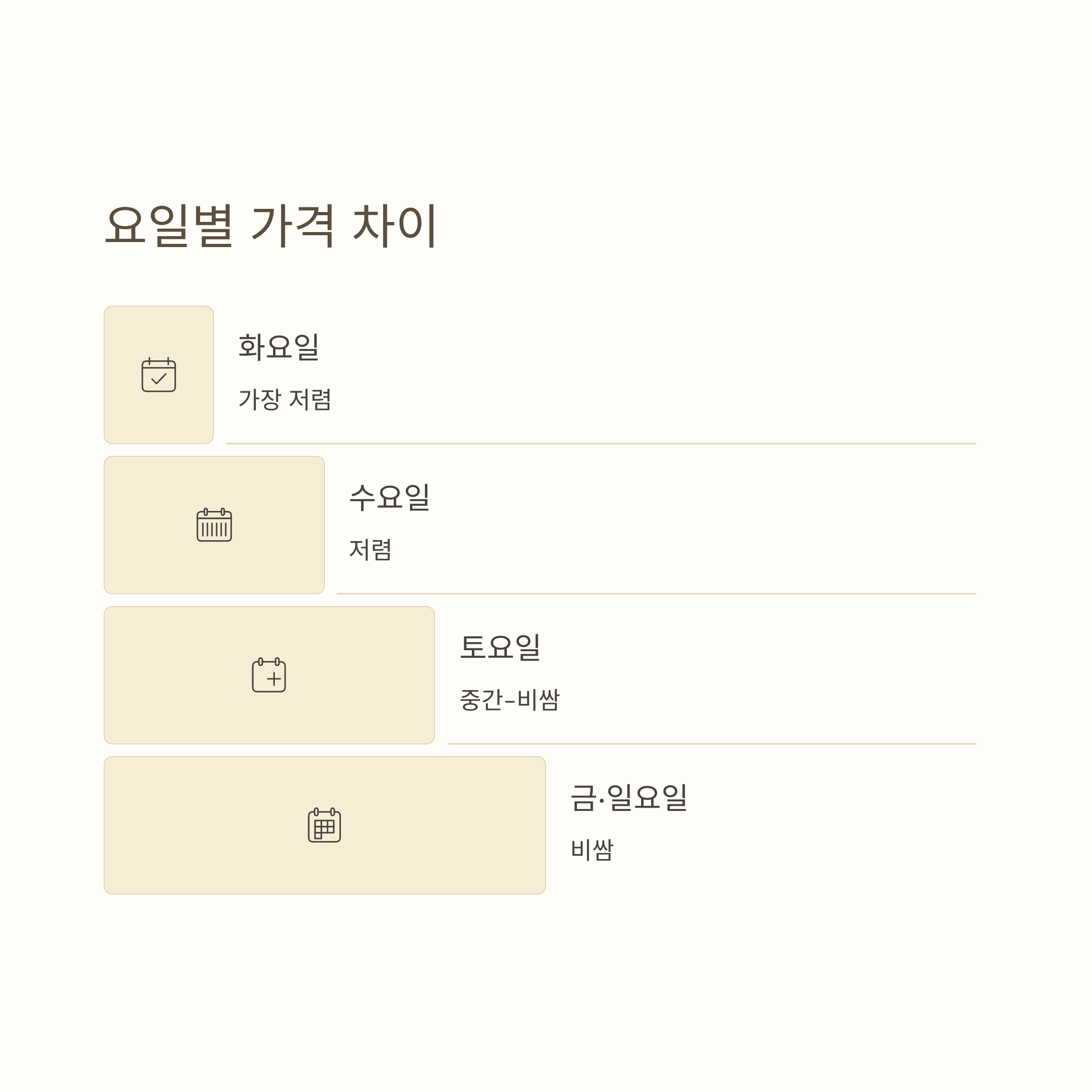 - 금요일, 일요일 출발: 비쌈 (주말 여행객 증가)