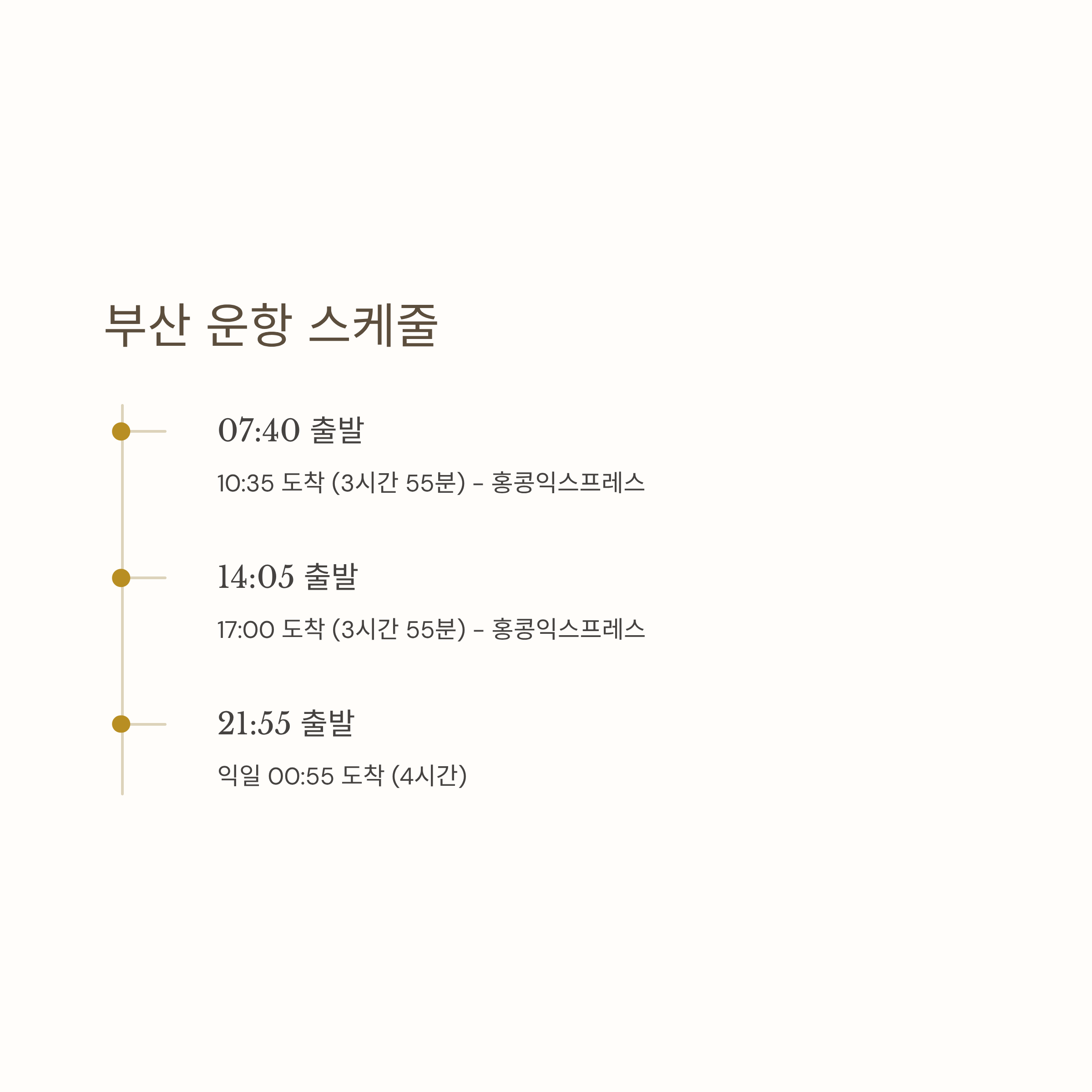 - 오후 14:05 출발 → 17:00 도착 (약 3시간 55분) - 홍콩익스프레스