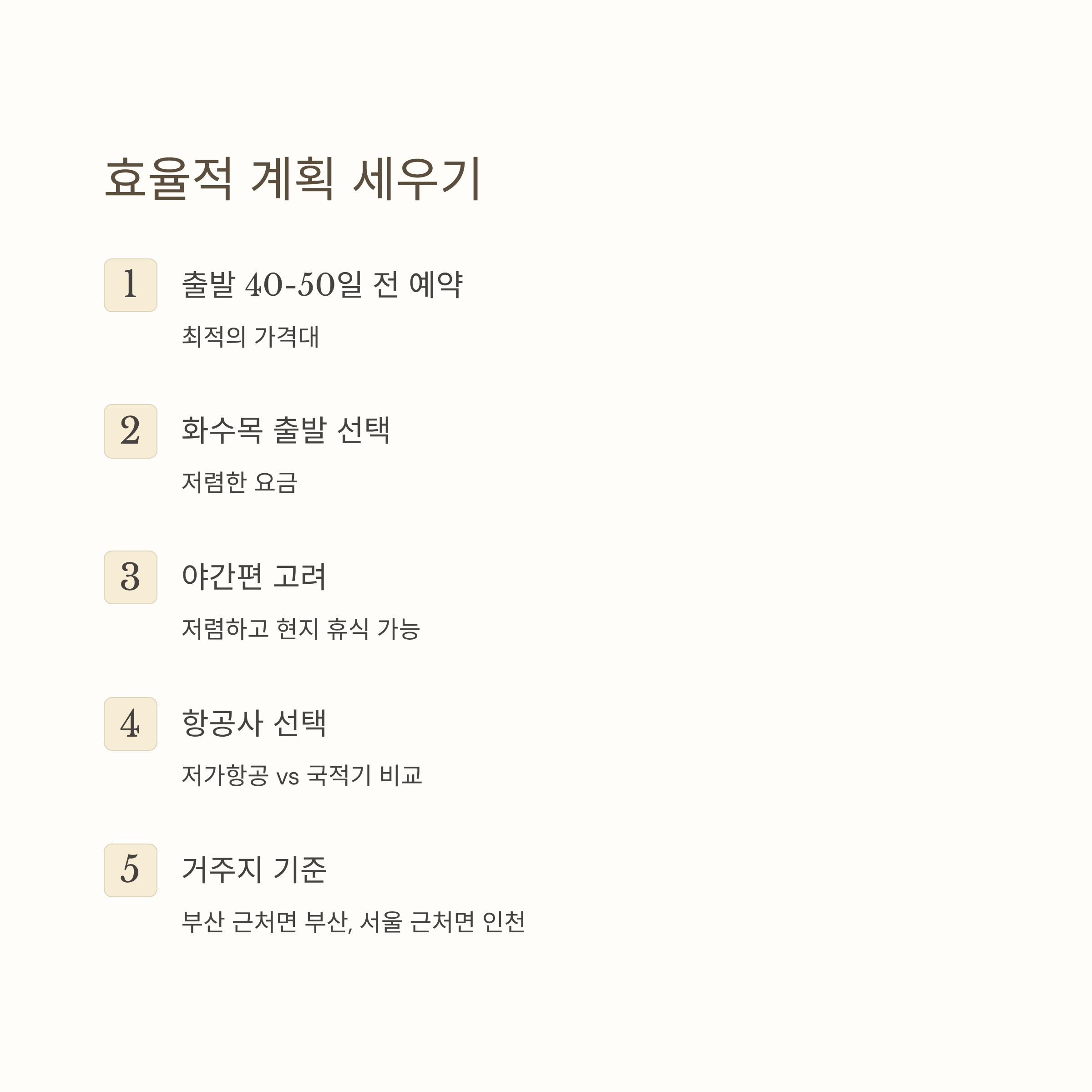 - 시간대: 야간편이 저렴하고 현지에서 충분한 휴식 가능