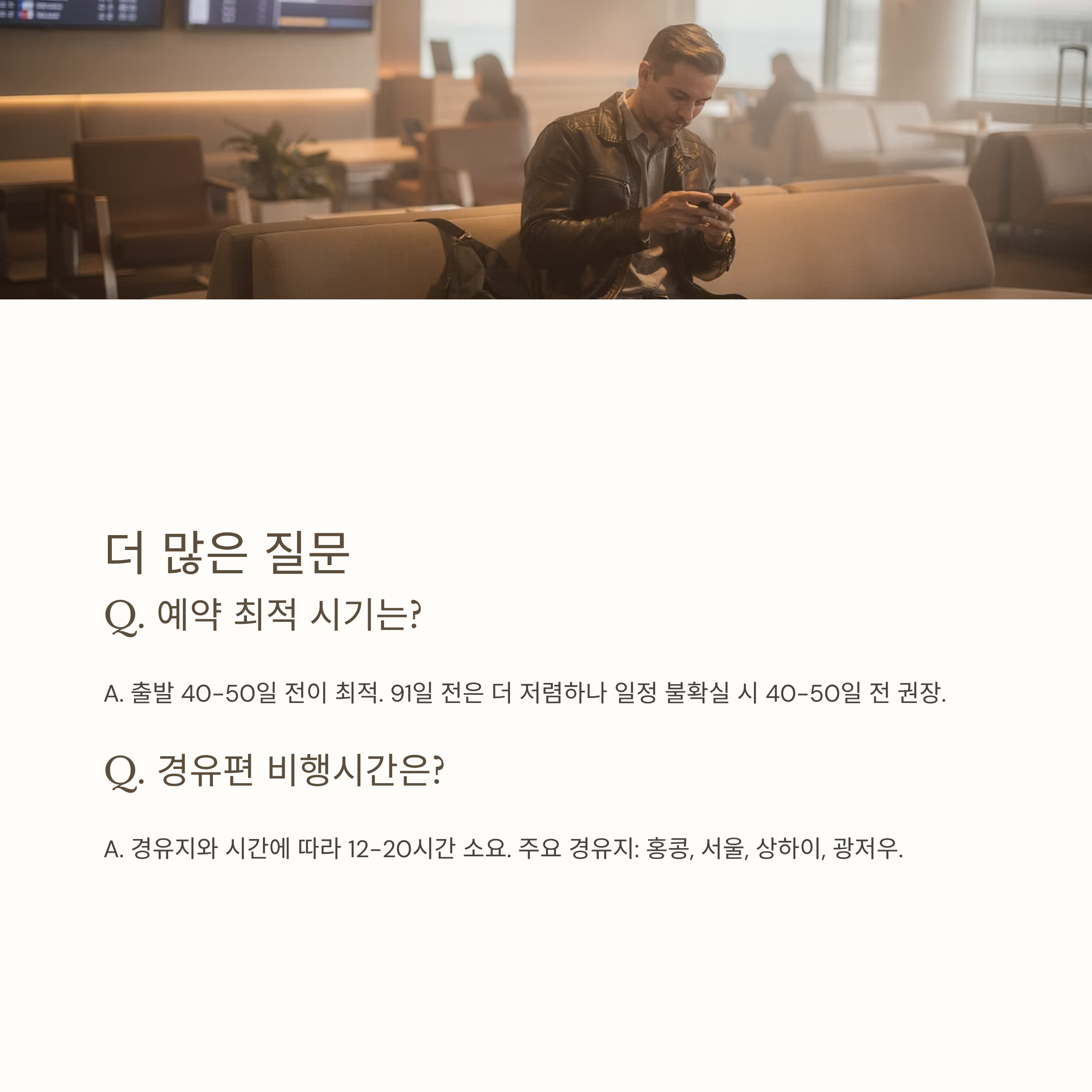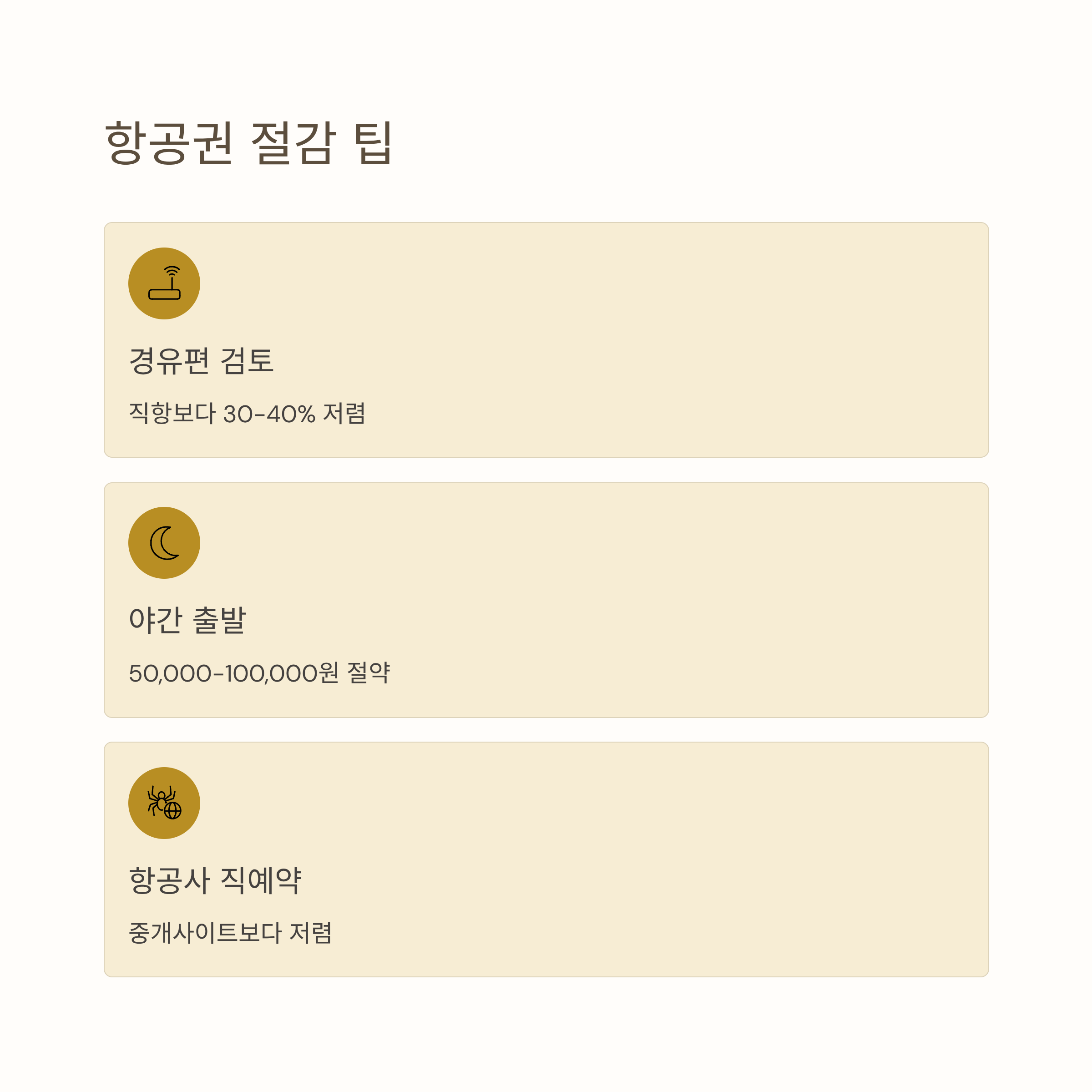 - 경유편 검토: 직항편보다 30~40% 저렴할 수 있음