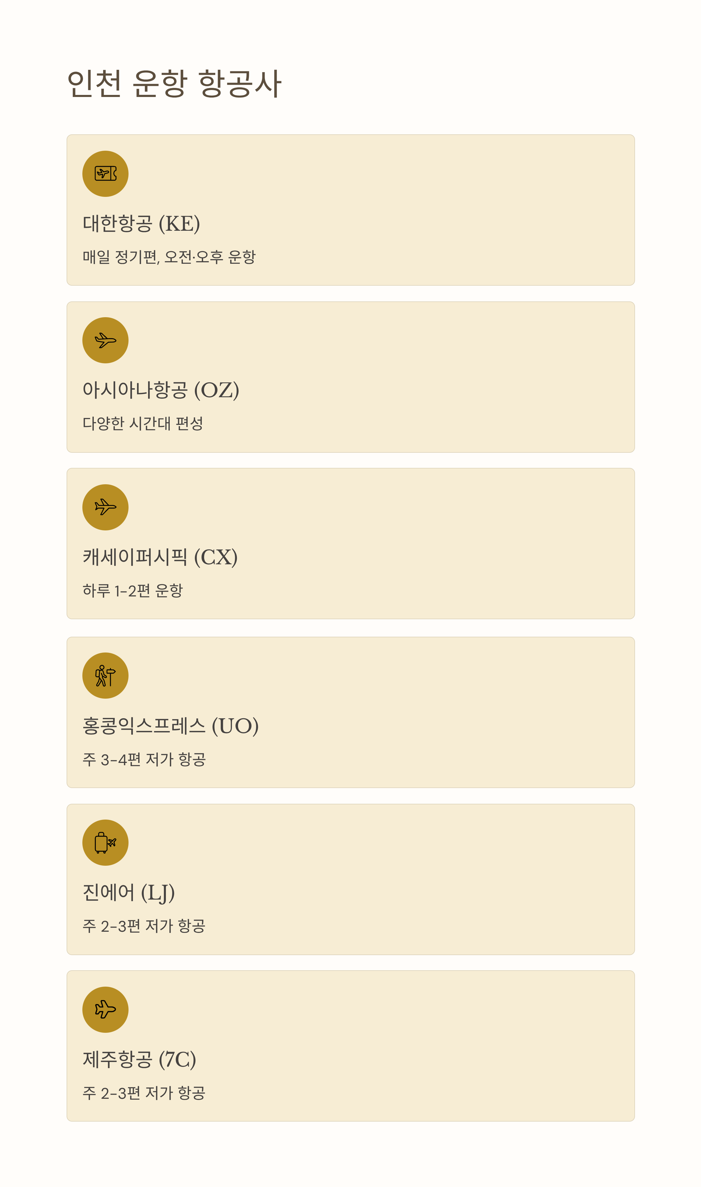 - 홍콩익스프레스: 주 7편 이상 운항 (가장 많은 편수)