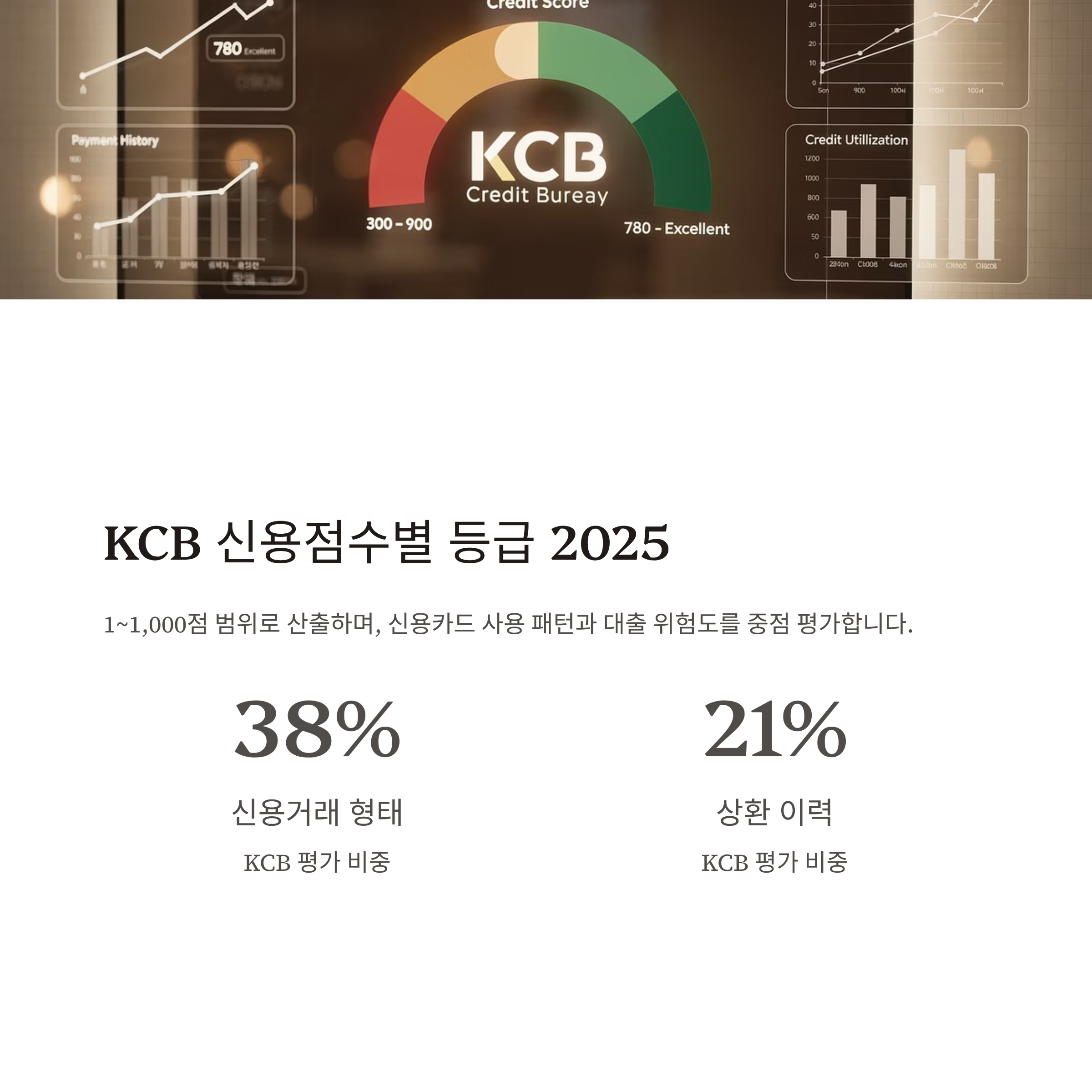 KCB(코리아크레딧뷰로)는 1~1,000점 범위로 신용점수를 산출하며, 신용카드 사용 패턴과 대출 위험도를 중점 평가합니다. 2025년 KCB 평가 비중은 신용거래 형태 38%, 상환 이력 21%로 구성됩니다.