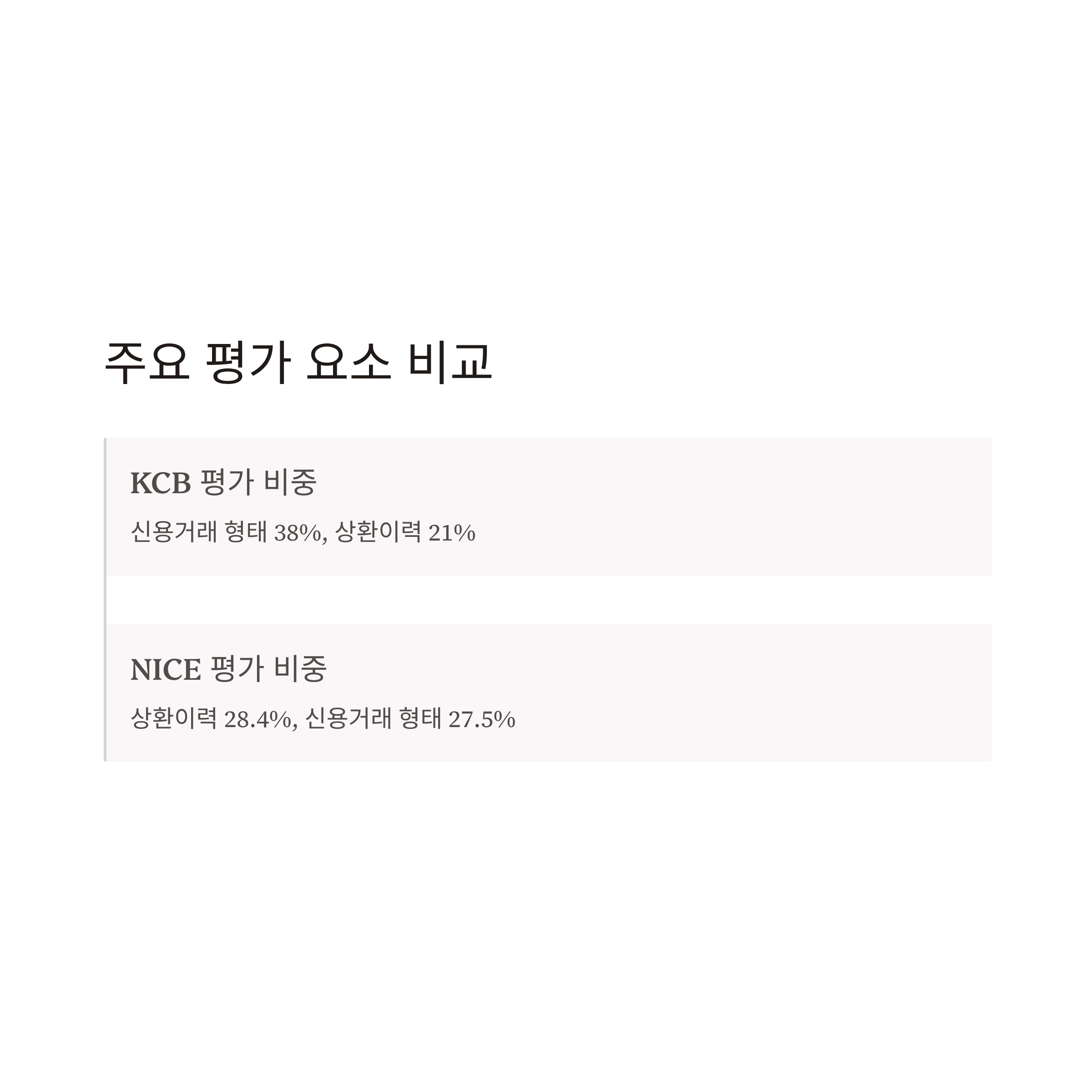 NICE(나이스평가정보)는 KCB보다 장기 금융거래 패턴과 연체 이력을 더 중요하게 반영합니다. 2025년 NICE 평가 비중은 상환 이력 28.4%, 신용거래 형태 27.5%입니다.