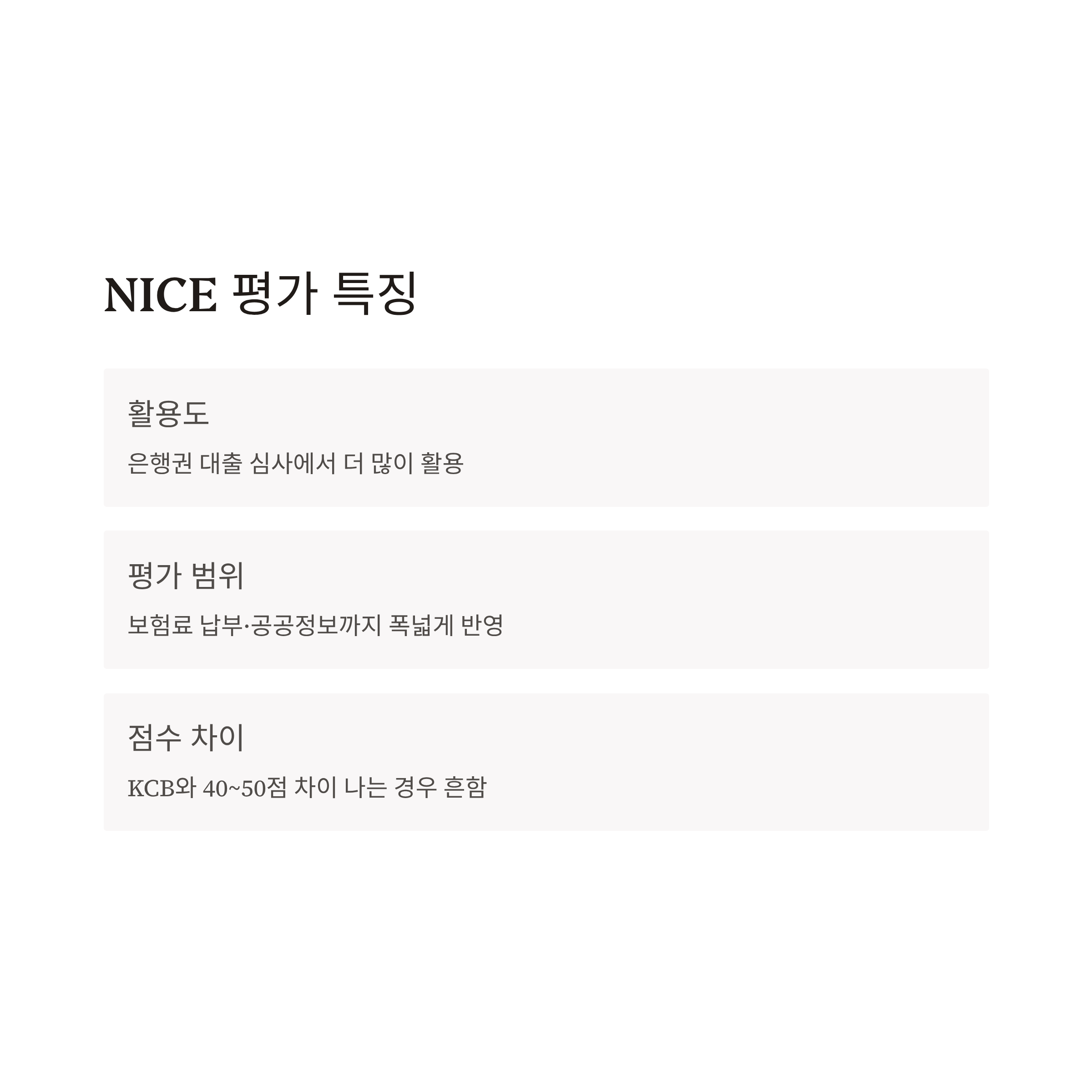 NICE는 은행권 대출 심사에서 더 많이 활용되며, 보험료 납부 이력이나 공공정보까지 폭넓게 반영합니다.