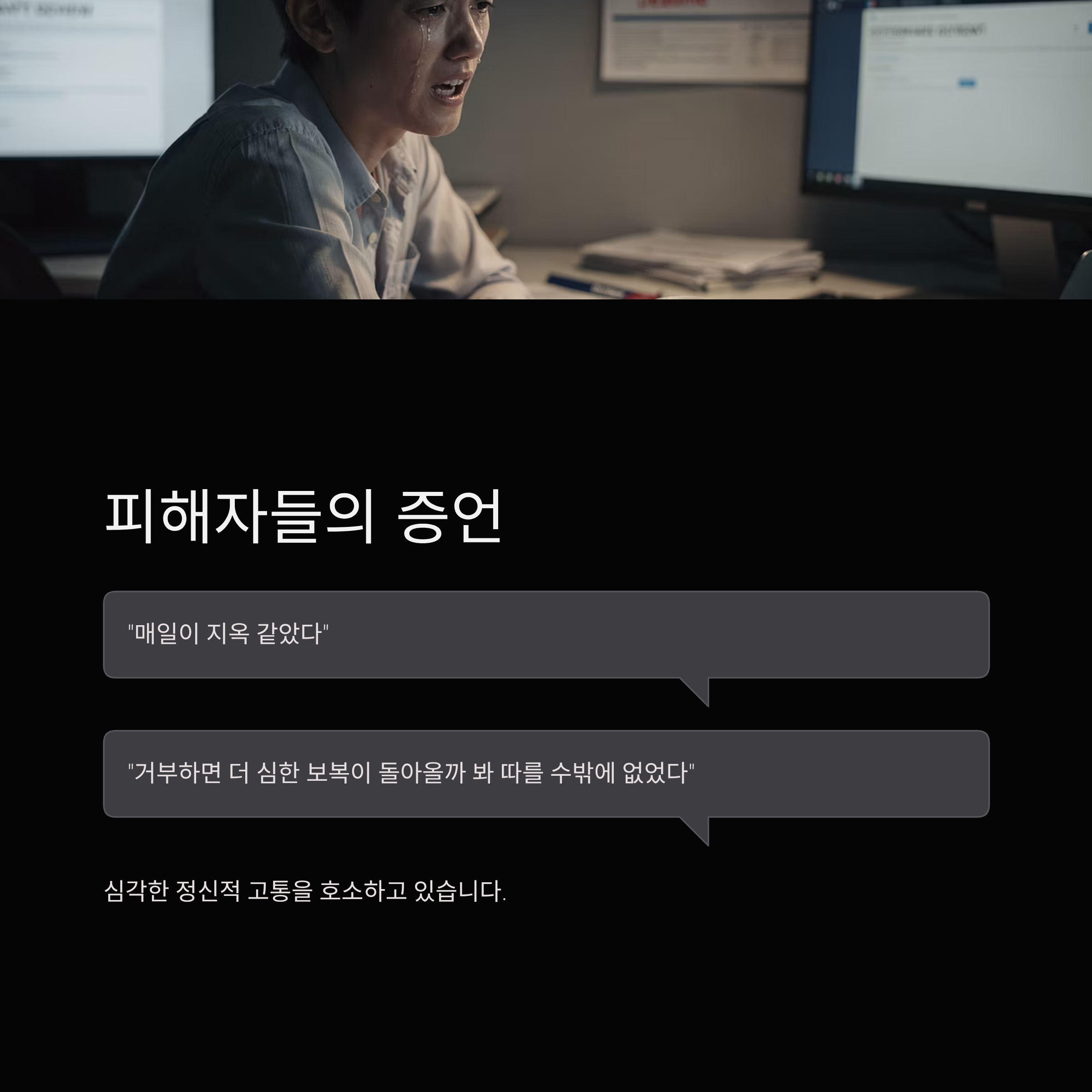 - 피해자들: "매일이 지옥 같았다", "거부하면 더 심한 보복이 돌아올까 봐 따를 수밖에 없었다"며 심각한 정신적 고통을 호소하고 있습니다.