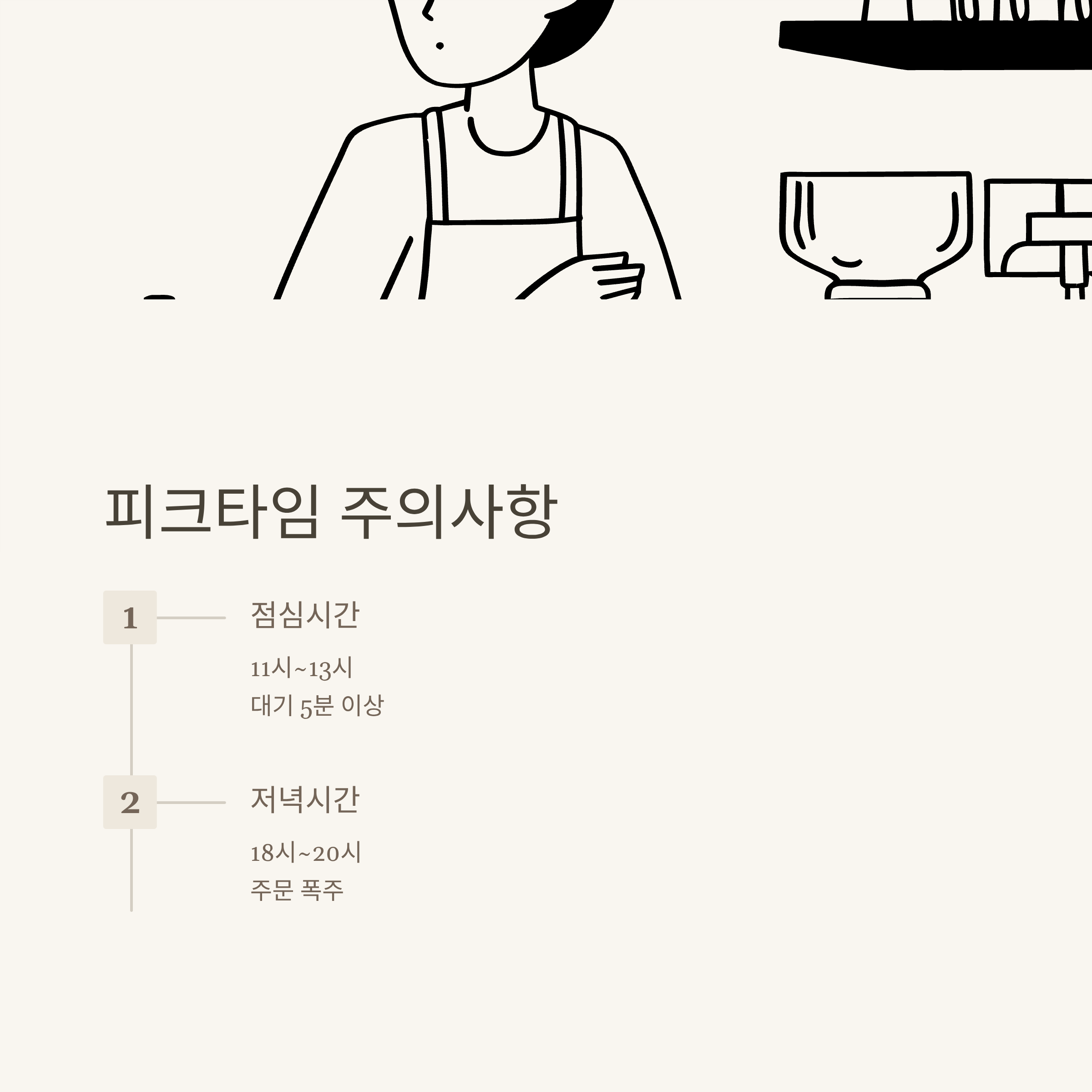 - 피크타임 주의: 점심(11시~13시)과 저녁(18시~20시) 시간대는 주문 폭주로 인해 전화 연결 대기 시간이 5분 이상 길어질 수 있습니다.