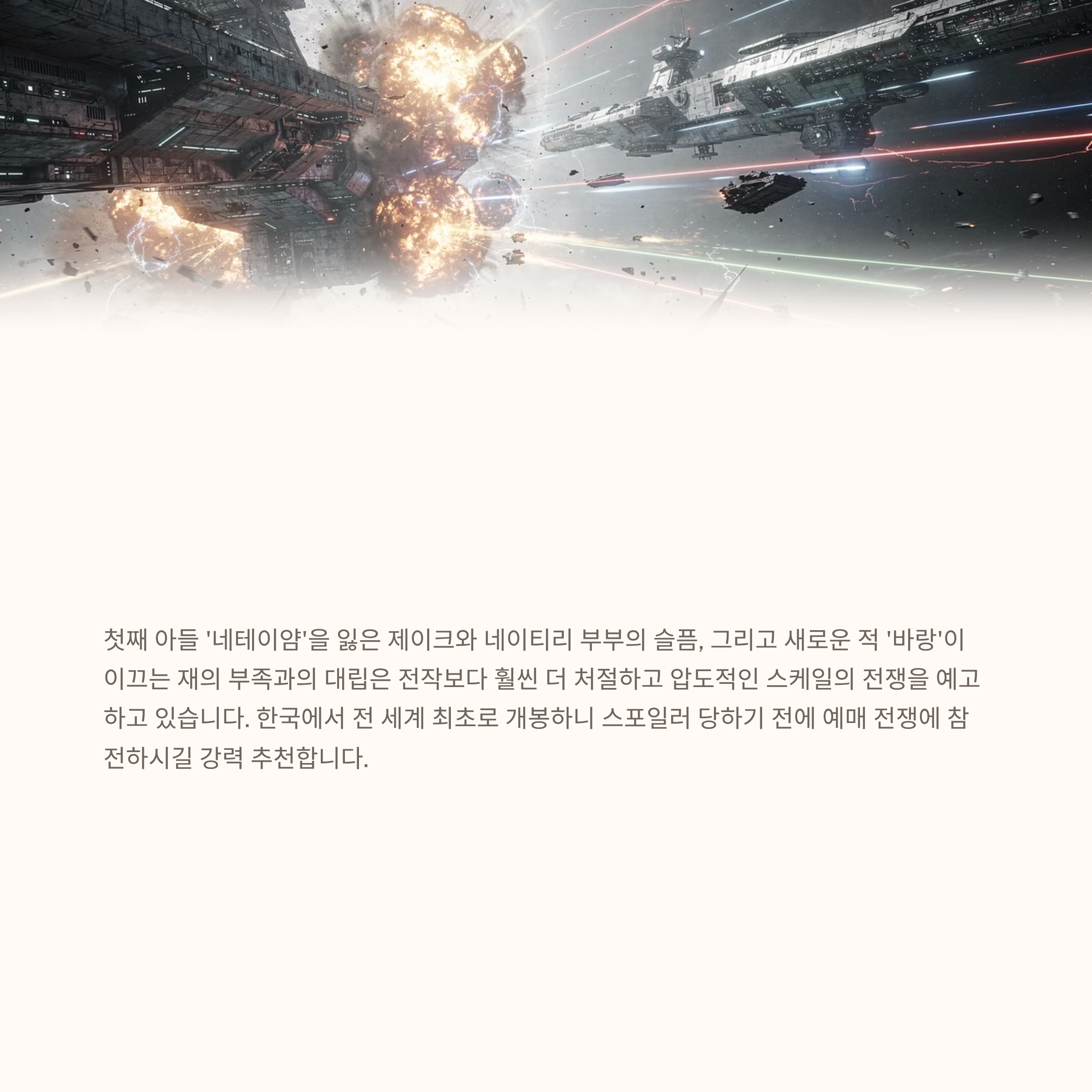 첫째 아들 '네테이얌'을 잃은 제이크와 네이티리 부부의 슬픔, 그리고 새로운 적 '바랑'이 이끄는 재의 부족과의 대립은 전작보다 훨씬 더 처절하고 압도적인 스케일의 전쟁을 예고하고 있습니다. 한국에서 전 세계 최초로 개봉하니 스포일러 당하기 전에 예매 전쟁에 참전하시길 강력 추천합니다.
