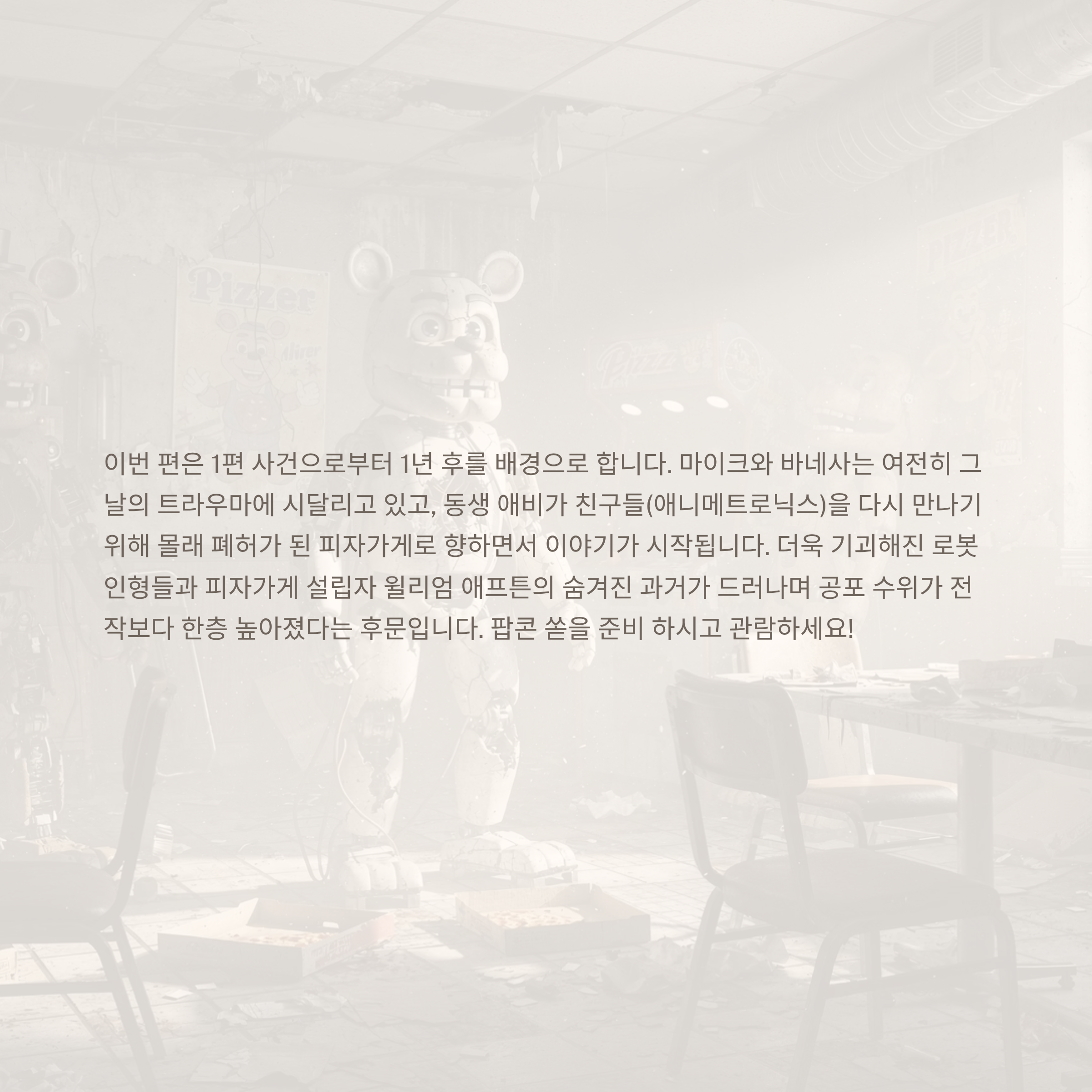 이번 편은 1편 사건으로부터 1년 후를 배경으로 합니다. 마이크와 바네사는 여전히 그날의 트라우마에 시달리고 있고, 동생 애비가 친구들(애니메트로닉스)을 다시 만나기 위해 몰래 폐허가 된 피자가게로 향하면서 이야기가 시작됩니다. 더욱 기괴해진 로봇 인형들과 피자가게 설립자 윌리엄 애프튼의 숨겨진 과거가 드러나며 공포 수위가 전작보다 한층 높아졌다는 후문입니다. 팝콘 쏟을 준비 하시고 관람하세요!