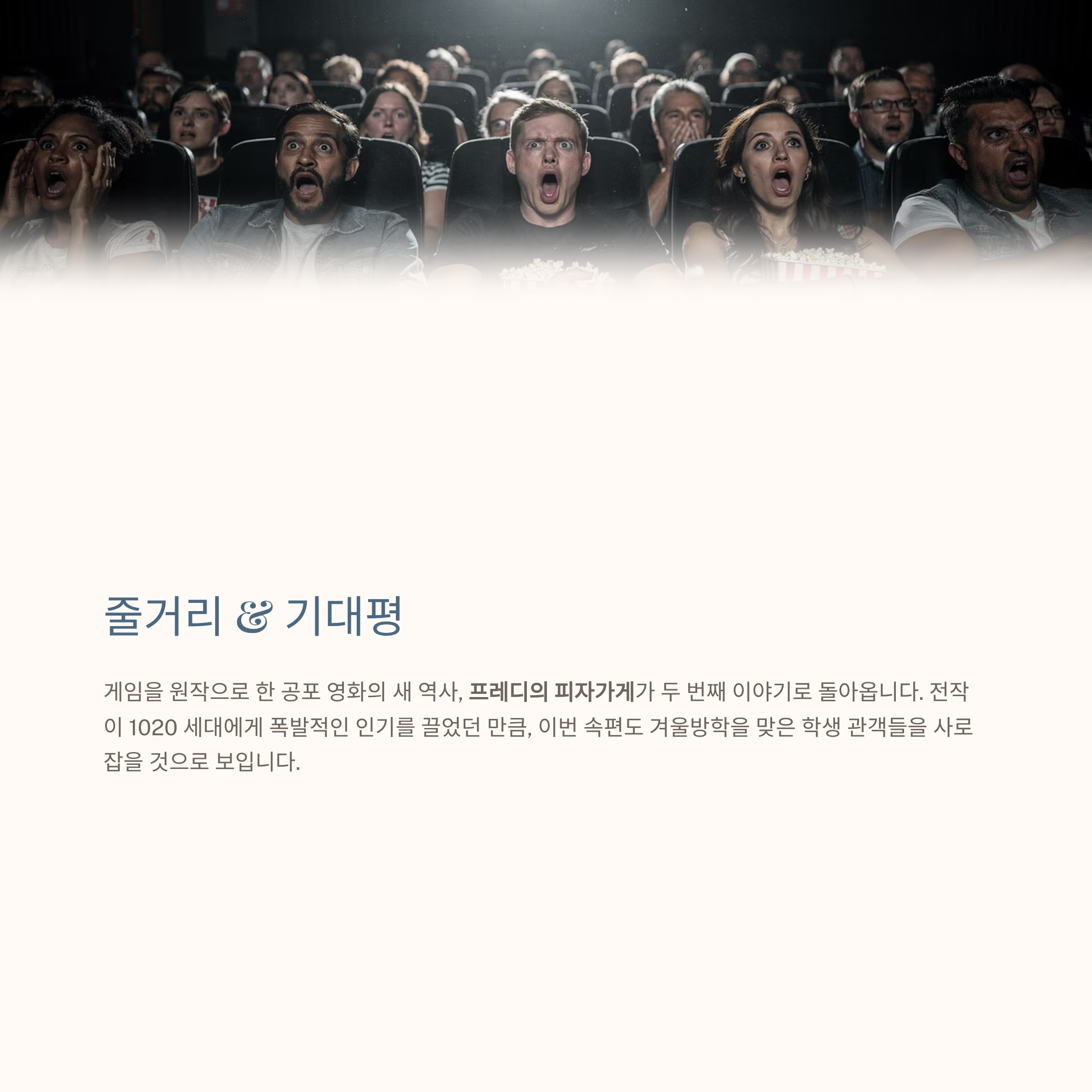게임을 원작으로 한 공포 영화의 새 역사, <프레디의 피자가게>가 두 번째 이야기로 돌아옵니다. 전작이 1020 세대에게 폭발적인 인기를 끌었던 만큼, 이번 속편도 겨울방학을 맞은 학생 관객들을 사로잡을 것으로 보입니다.