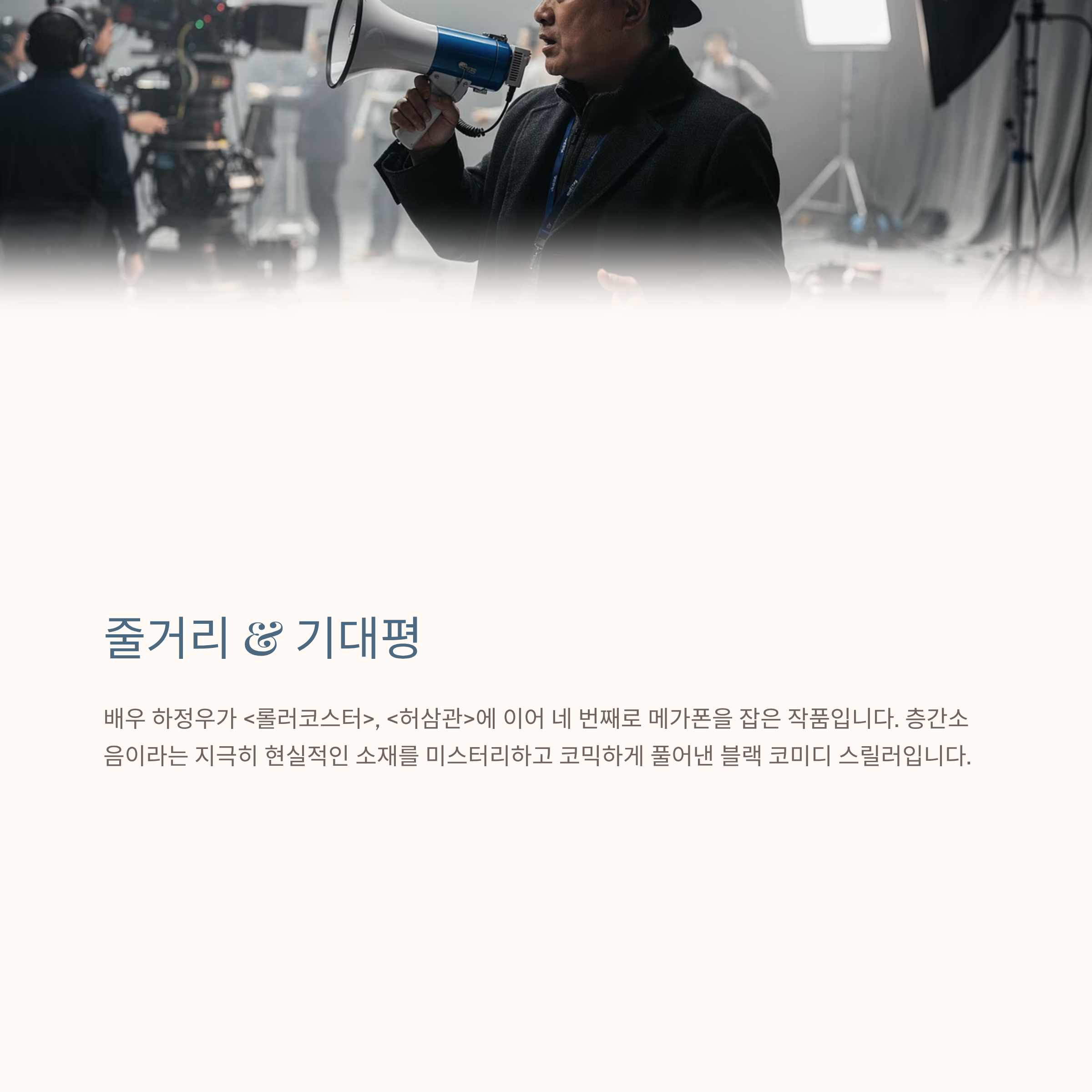 배우 하정우가 <롤러코스터>, <허삼관>에 이어 네 번째로 메가폰을 잡은 작품입니다. 층간소음이라는 지극히 현실적인 소재를 미스터리하고 코믹하게 풀어낸 블랙 코미디 스릴러입니다.