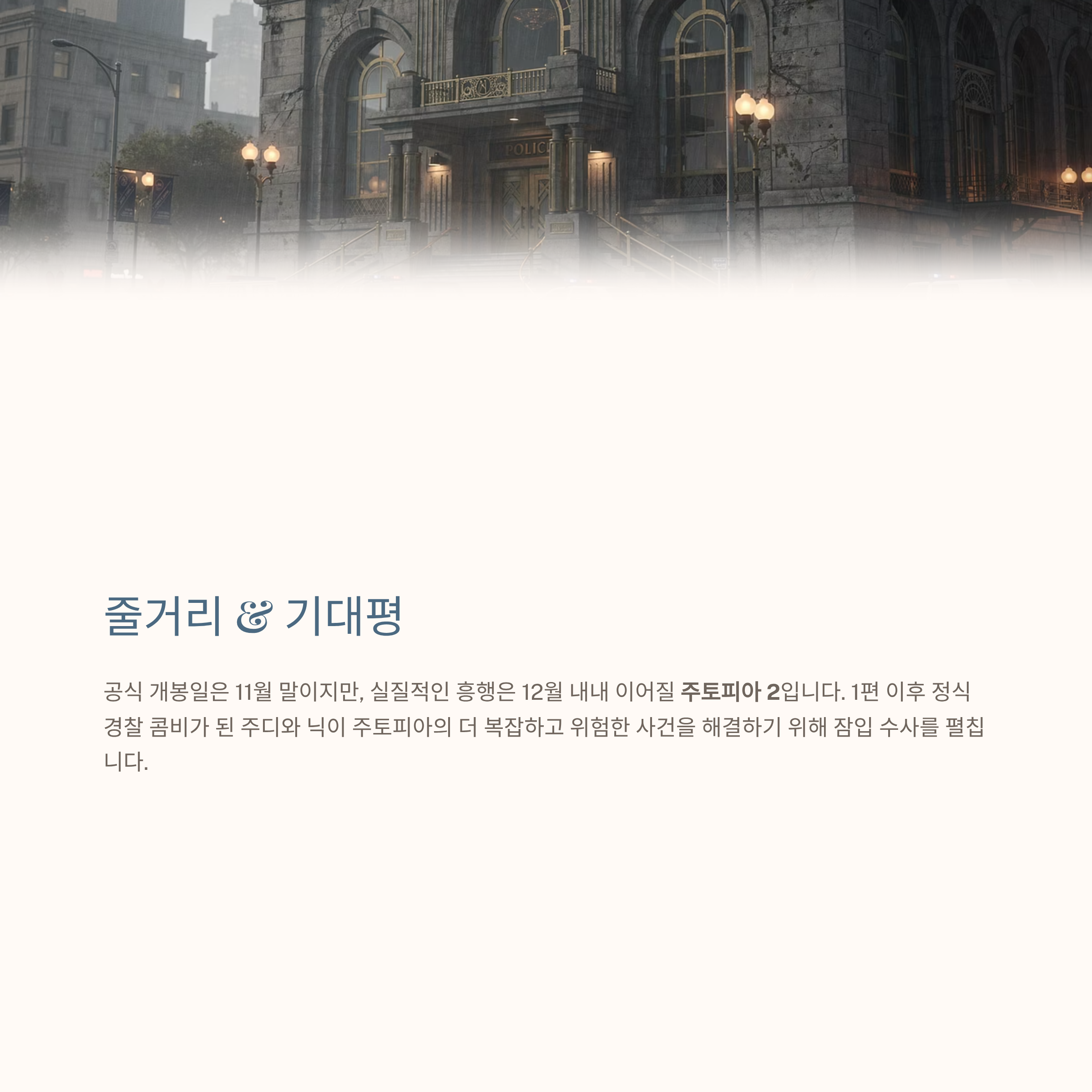 공식 개봉일은 11월 말이지만, 실질적인 흥행은 12월 내내 이어질 <주토피아 2>입니다. 1편 이후 정식 경찰 콤비가 된 주디와 닉이 주토피아의 더 복잡하고 위험한 사건을 해결하기 위해 잠입 수사를 펼칩니다.