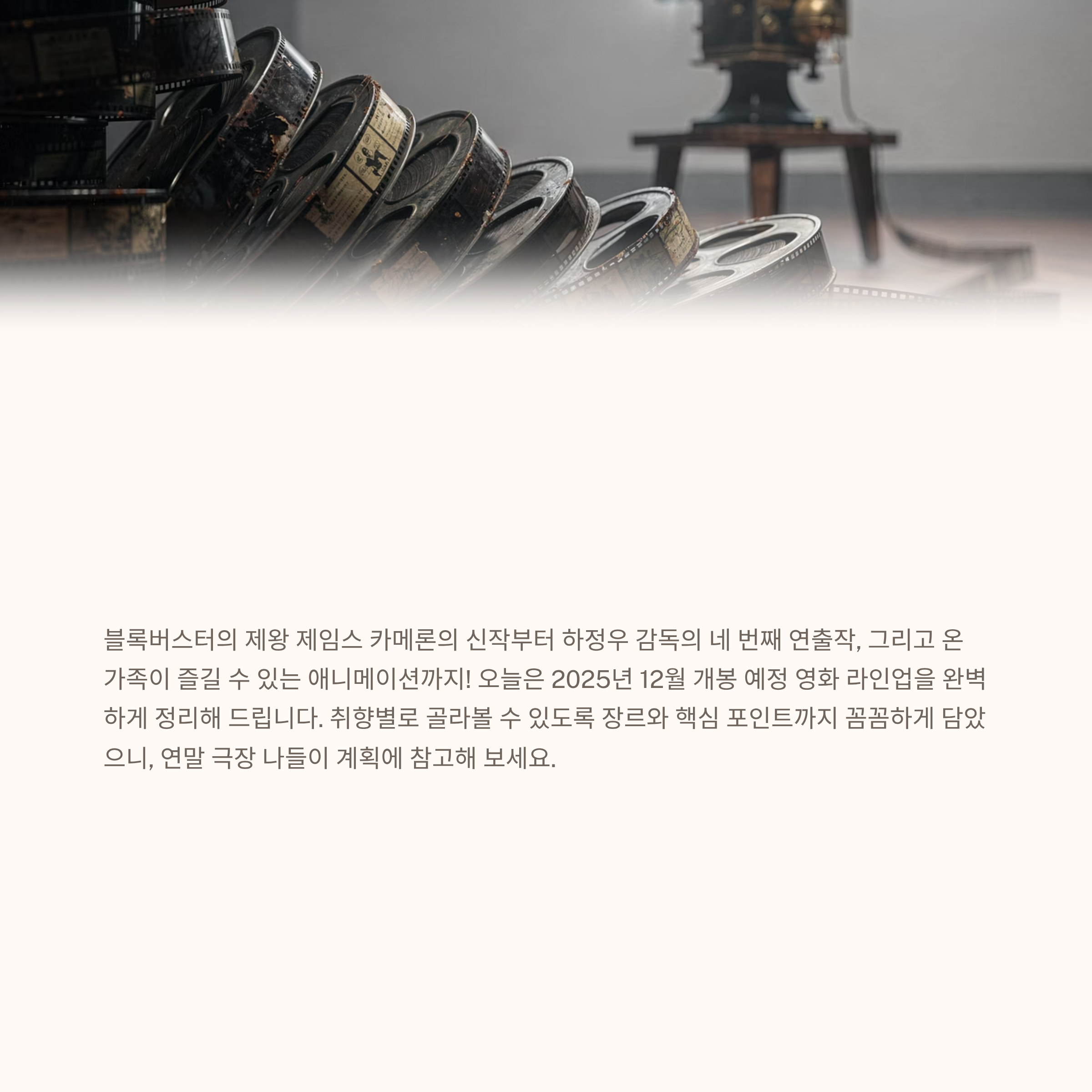 2025년의 대미를 장식할 화려한 영화 라인업, 벌써부터 기대되지 않으신가요? 사랑하는 사람들과 함께 극장 나들이 계획을 세워보시길 바랍니다. 즐겁고 따뜻한 연말 보내세요! 🎄🍿