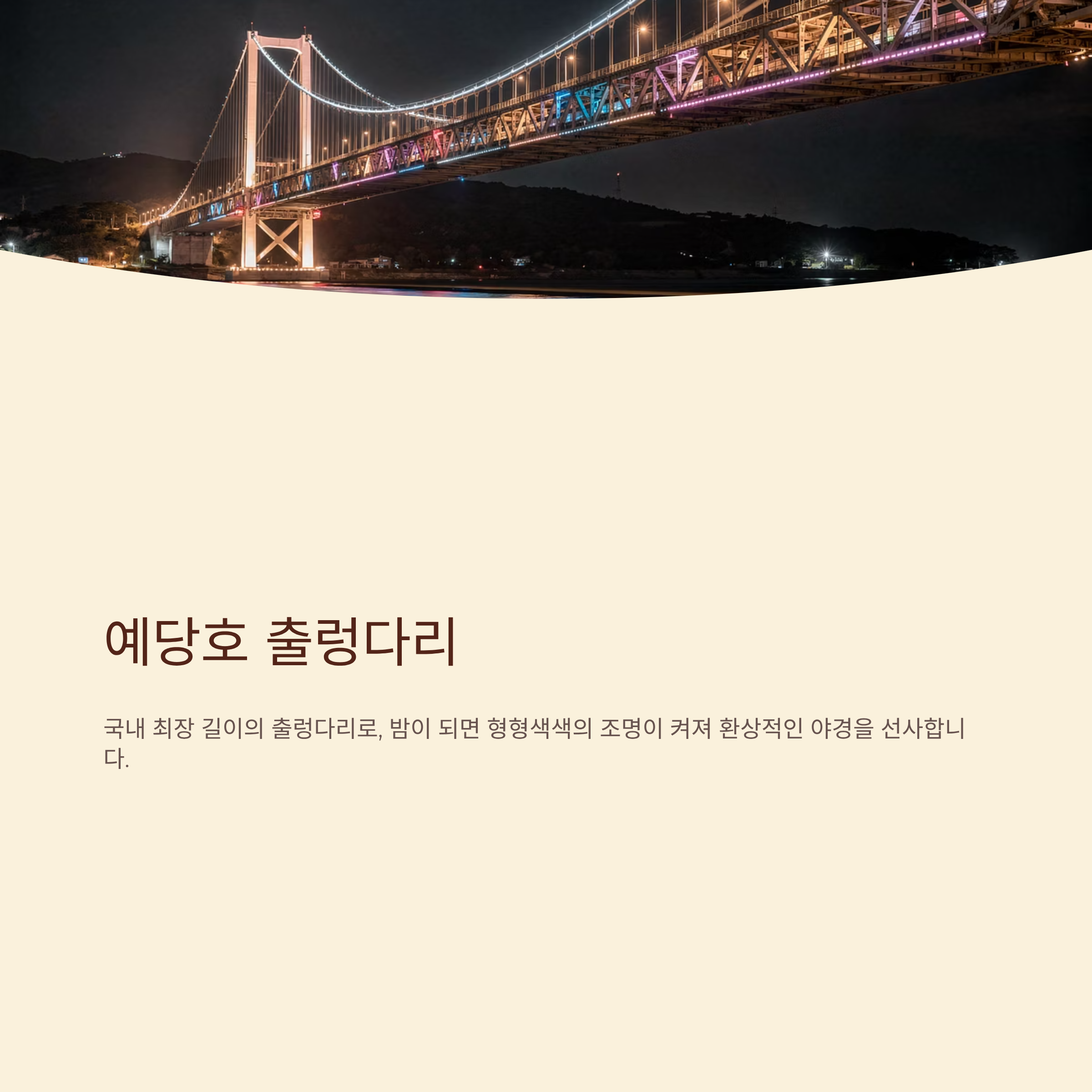 - 예당호 출렁다리: 국내 최장 길이의 출렁다리로, 밤이 되면 형형색색의 조명이 켜져 환상적인 야경을 선사합니다.