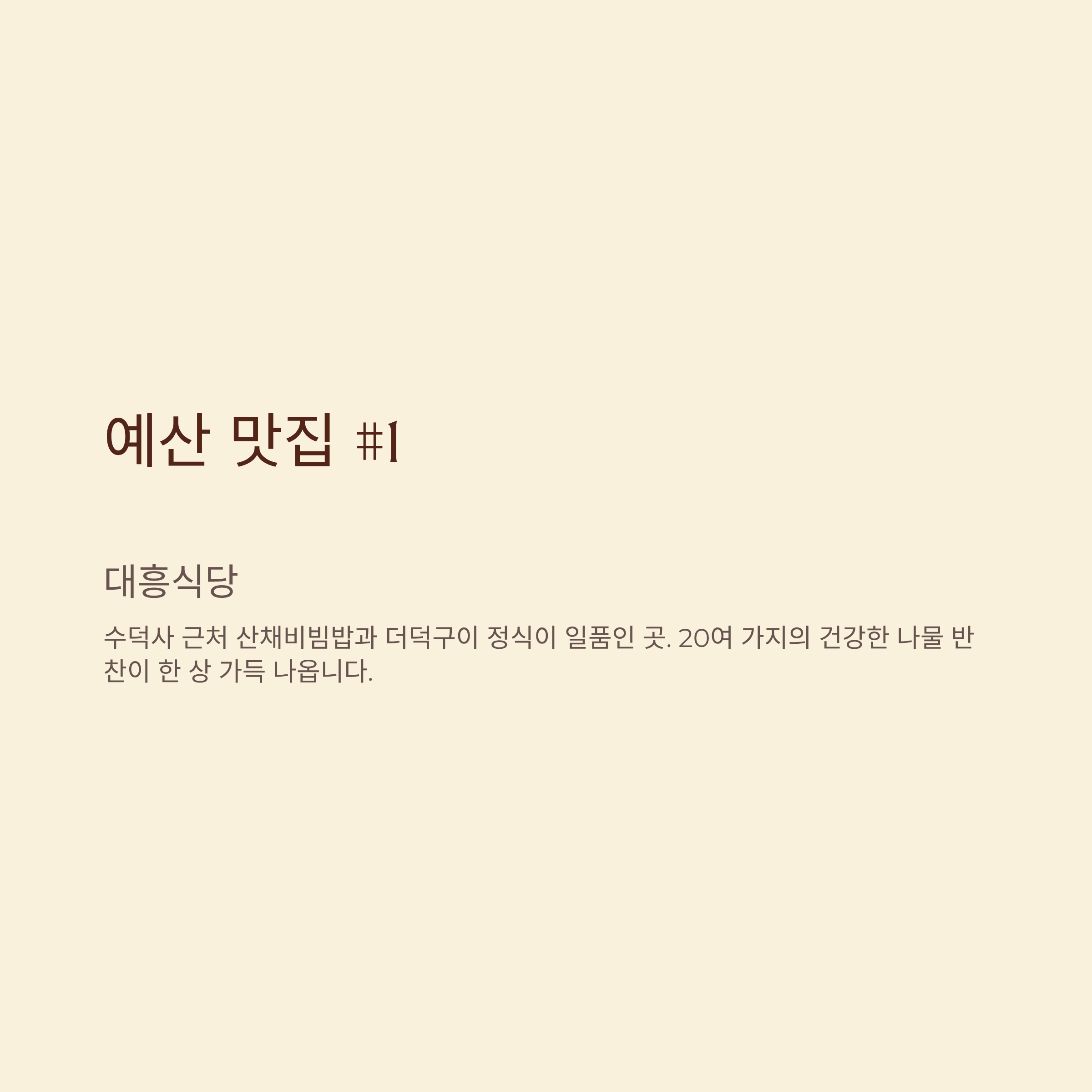 - 대흥식당: 수덕사 근처 산채비빔밥과 더덕구이 정식이 일품인 곳. 20여 가지의 건강한 나물 반찬이 한 상 가득 나옵니다.
