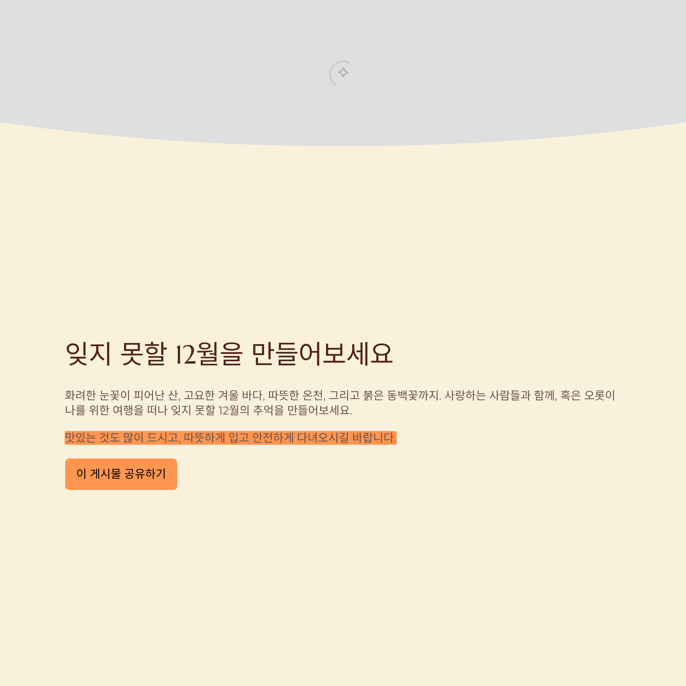 화려한 눈꽃이 피어난 산, 고요한 겨울 바다, 따뜻한 온천, 그리고 붉은 동백꽃까지. 사랑하는 사람들과 함께, 혹은 오롯이 나를 위한 여행을 떠나 잊지 못할 12월의 추억을 만들어보세요. 맛있는 것도 많이 드시고, 따뜻하게 입고 안전하게 다녀오시길 바랍니다.
