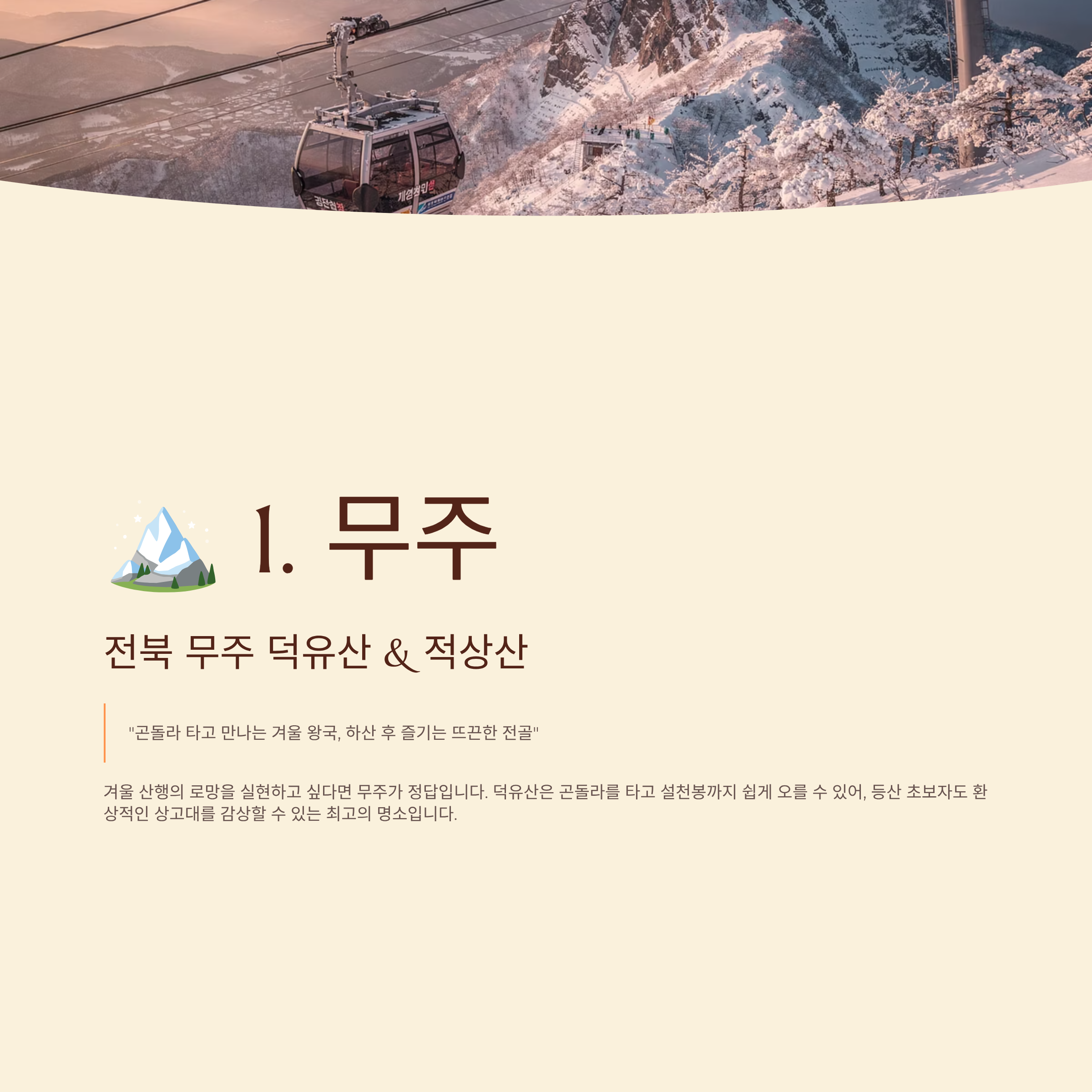 겨울 산행의 로망을 실현하고 싶다면 무주가 정답입니다. 덕유산은 곤돌라를 타고 설천봉까지 쉽게 오를 수 있어, 등산 초보자도 환상적인 상고대(나무에 맺힌 서리꽃)를 감상할 수 있는 최고의 명소입니다.