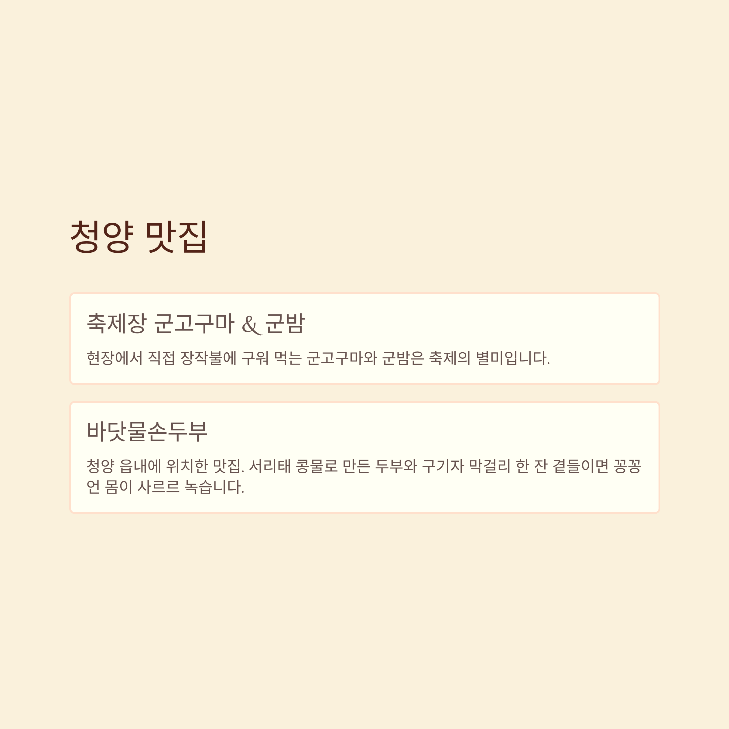 - 바닷물손두부: 청양 읍내에 위치한 맛집. 서리태 콩물로 만든 두부와 구기자 막걸리 한 잔 곁들이면 꽁꽁 언 몸이 사르르 녹습니다.