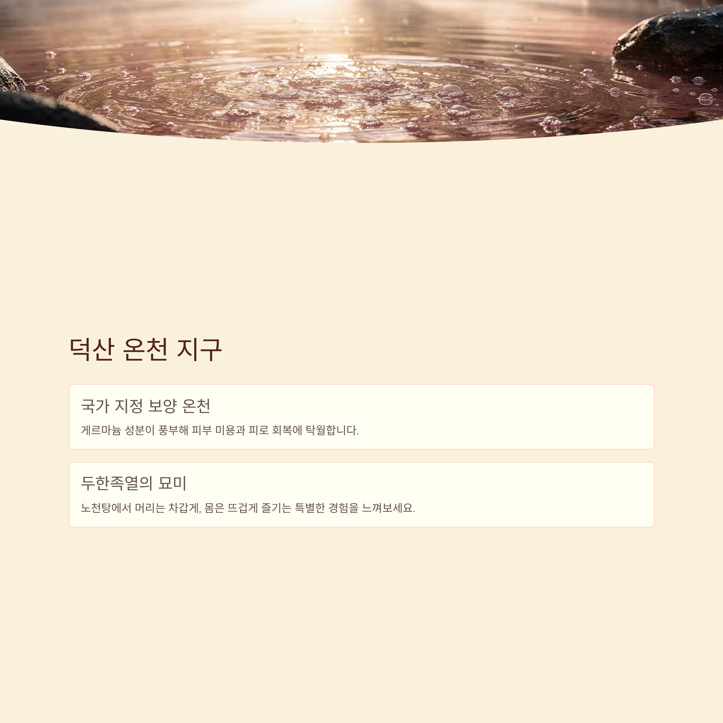 - 덕산 온천 지구: 국가 지정 보양 온천으로, 게르마늄 성분이 풍부해 피부 미용과 피로 회복에 탁월합니다. 노천탕에서 머리는 차갑게, 몸은 뜨겁게 즐기는 '두한족열'의 묘미를 느껴보세요.