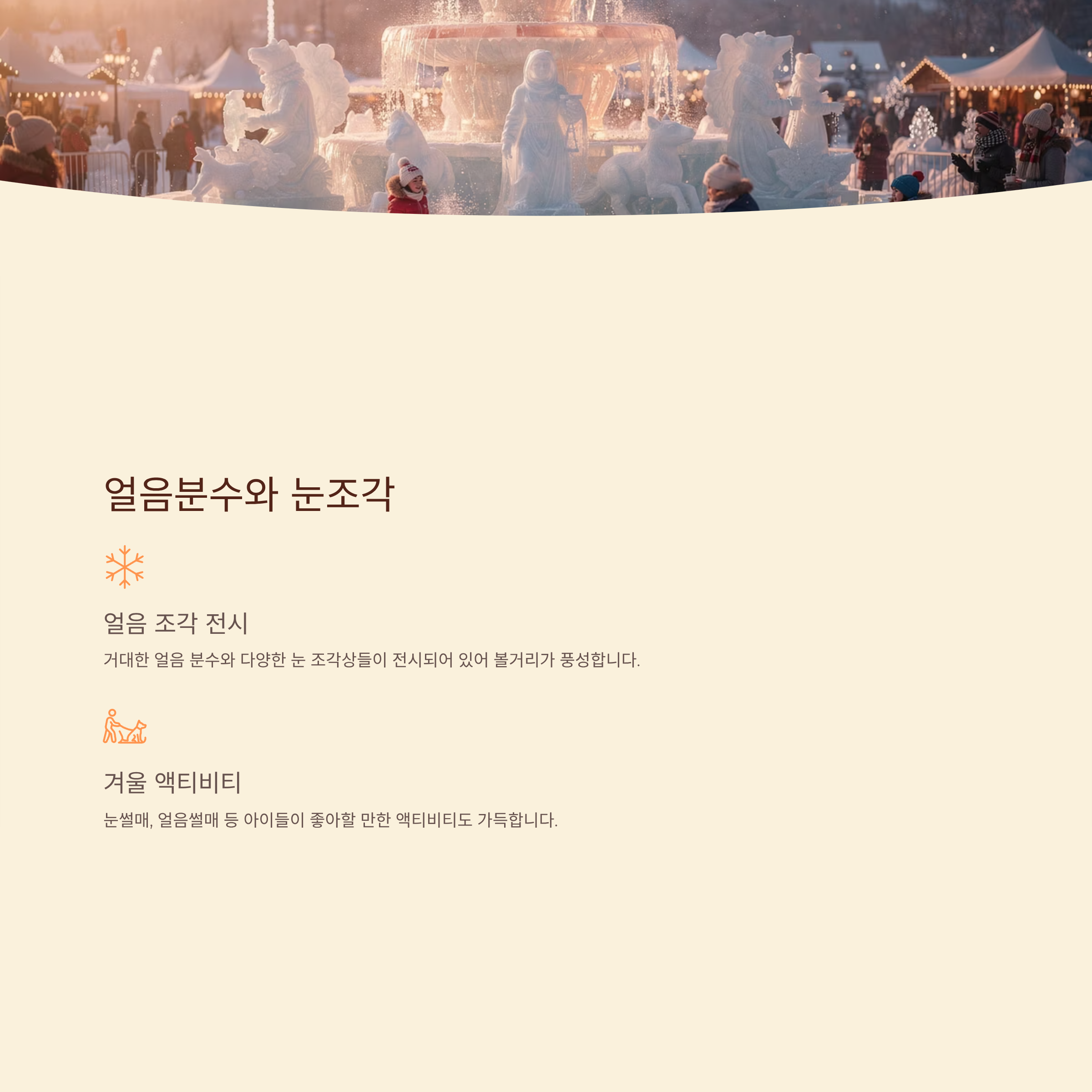 - 얼음분수와 눈조각: 거대한 얼음 분수와 다양한 눈 조각상들이 전시되어 있어 볼거리가 풍성합니다. 눈썰매, 얼음썰매 등 아이들이 좋아할 만한 액티비티도 가득합니다.