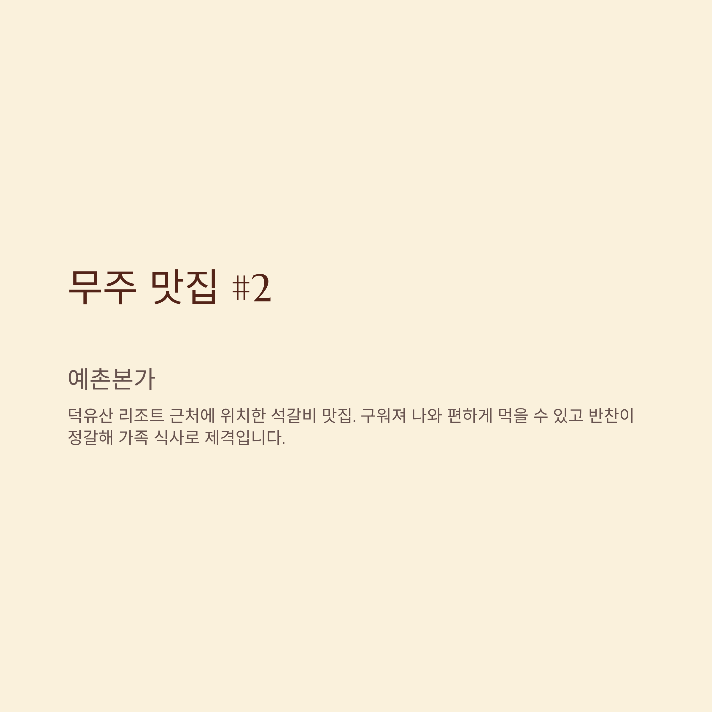 - 예촌본가: 덕유산 리조트 근처에 위치한 석갈비 맛집. 구워져 나와 편하게 먹을 수 있고 반찬이 정갈해 가족 식사로 제격입니다.