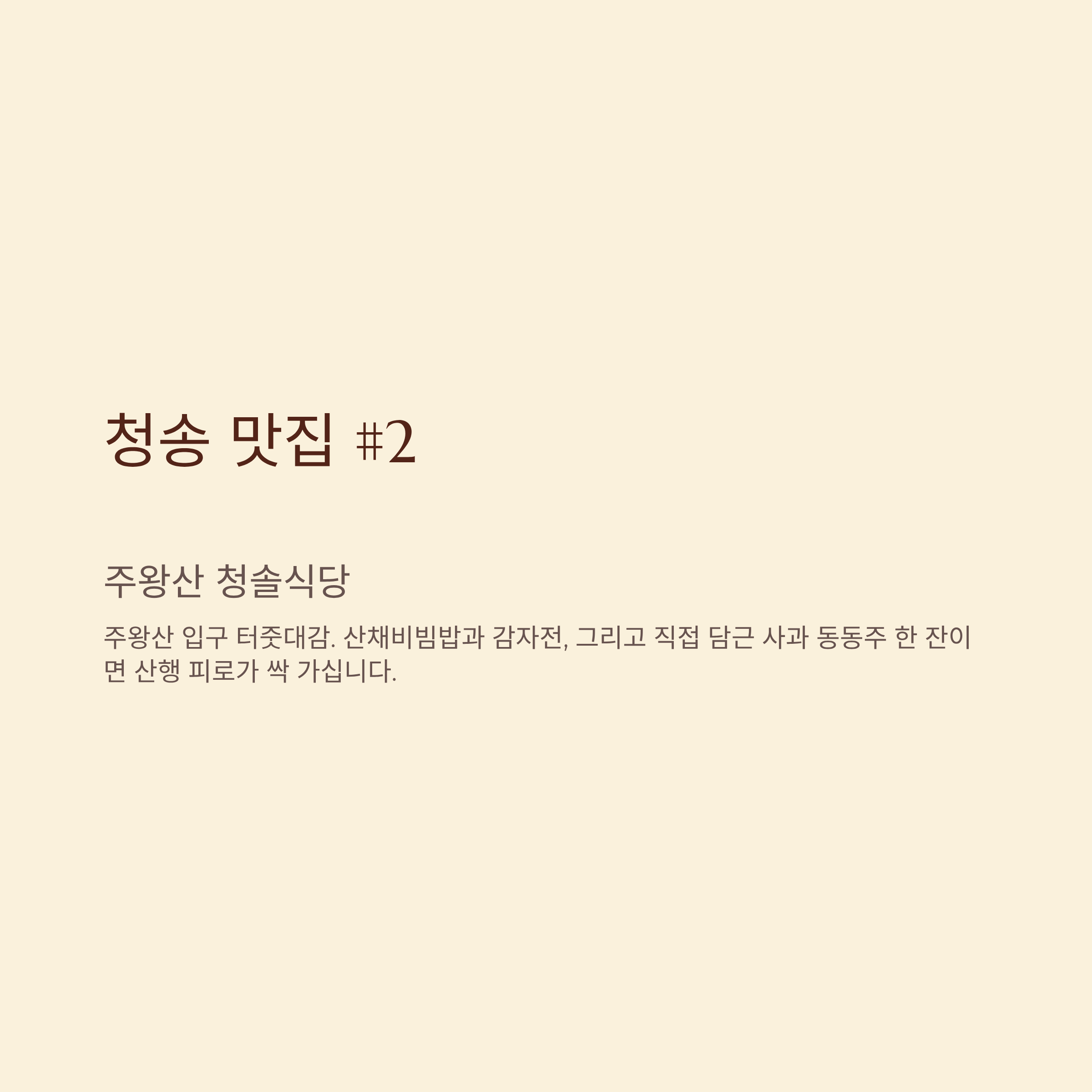 - 주왕산 청솔식당: 주왕산 입구 터줏대감. 산채비빔밥과 감자전, 그리고 직접 담근 사과 동동주 한 잔이면 산행 피로가 싹 가십니다.