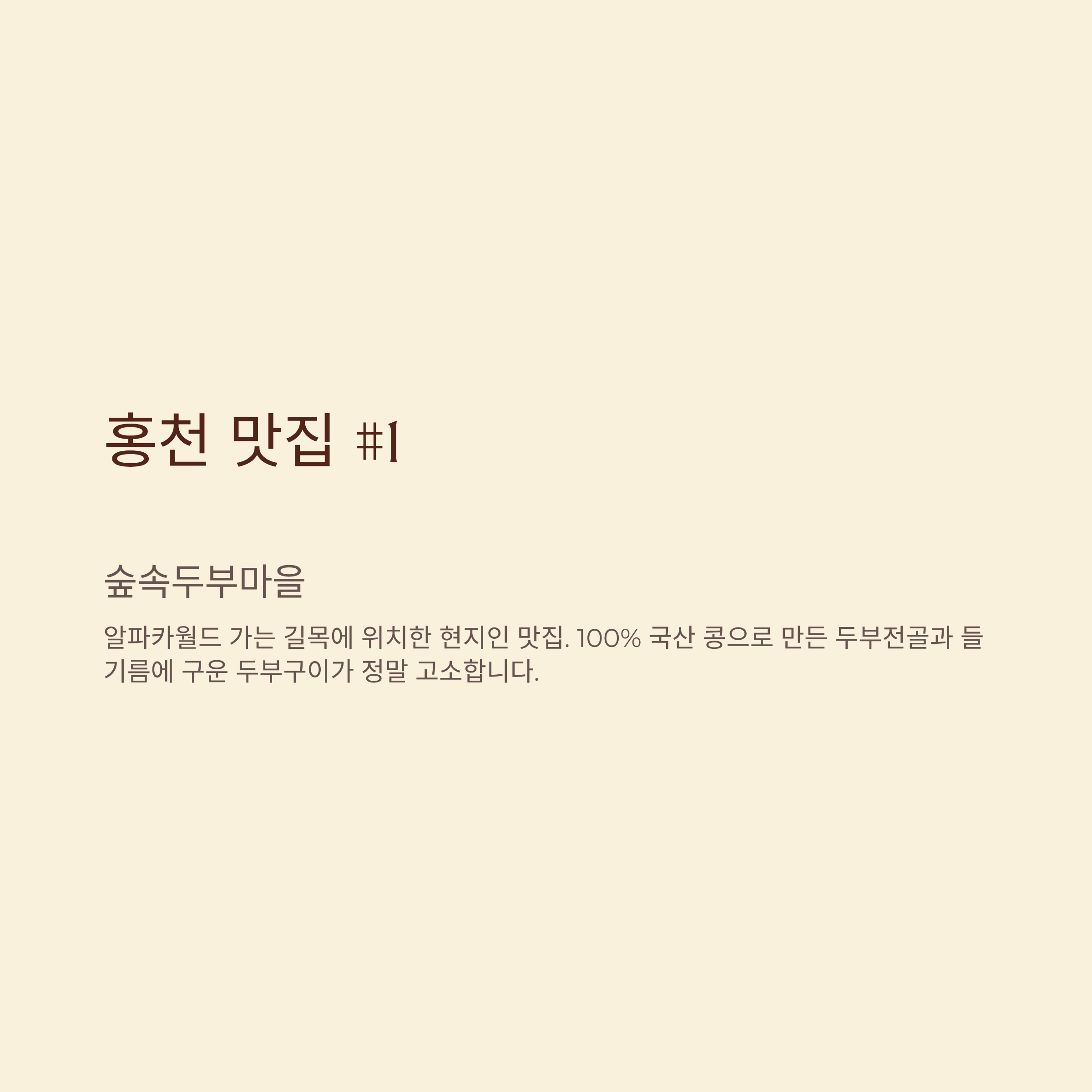 - 숲속두부마을: 알파카월드 가는 길목에 위치한 현지인 맛집. 100% 국산 콩으로 만든 두부전골과 들기름에 구운 두부구이가 정말 고소합니다.