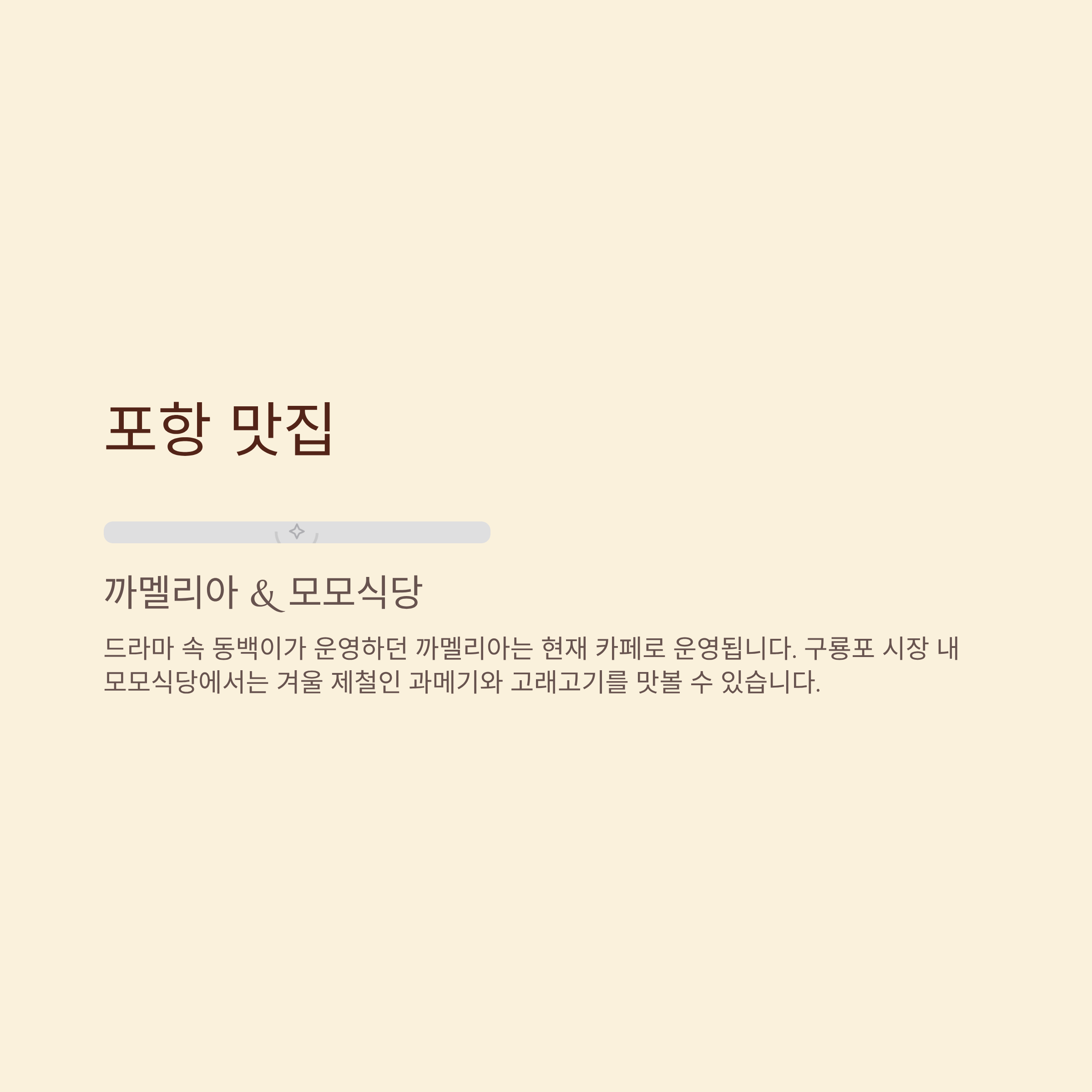 - 까멜리아: 드라마 속 동백이가 운영하던 그 가게. 현재는 카페로 운영되며 구룡포의 명소가 되었습니다.