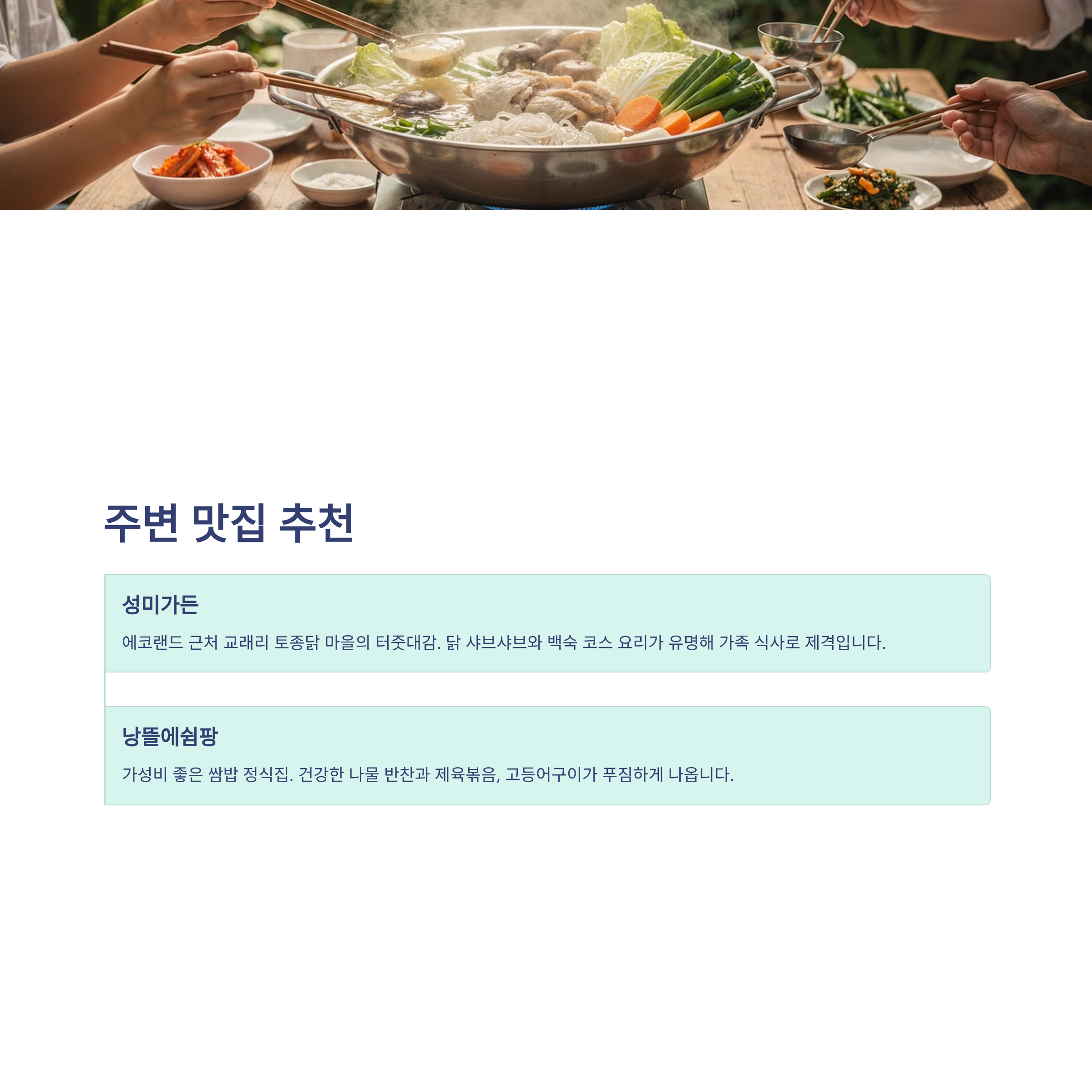 성미가든: 에코랜드 근처 교래리 토종닭 마을의 터줏대감. 닭 샤브샤브와 백숙 코스 요리가 유명해 가족 식사로 제격입니다.