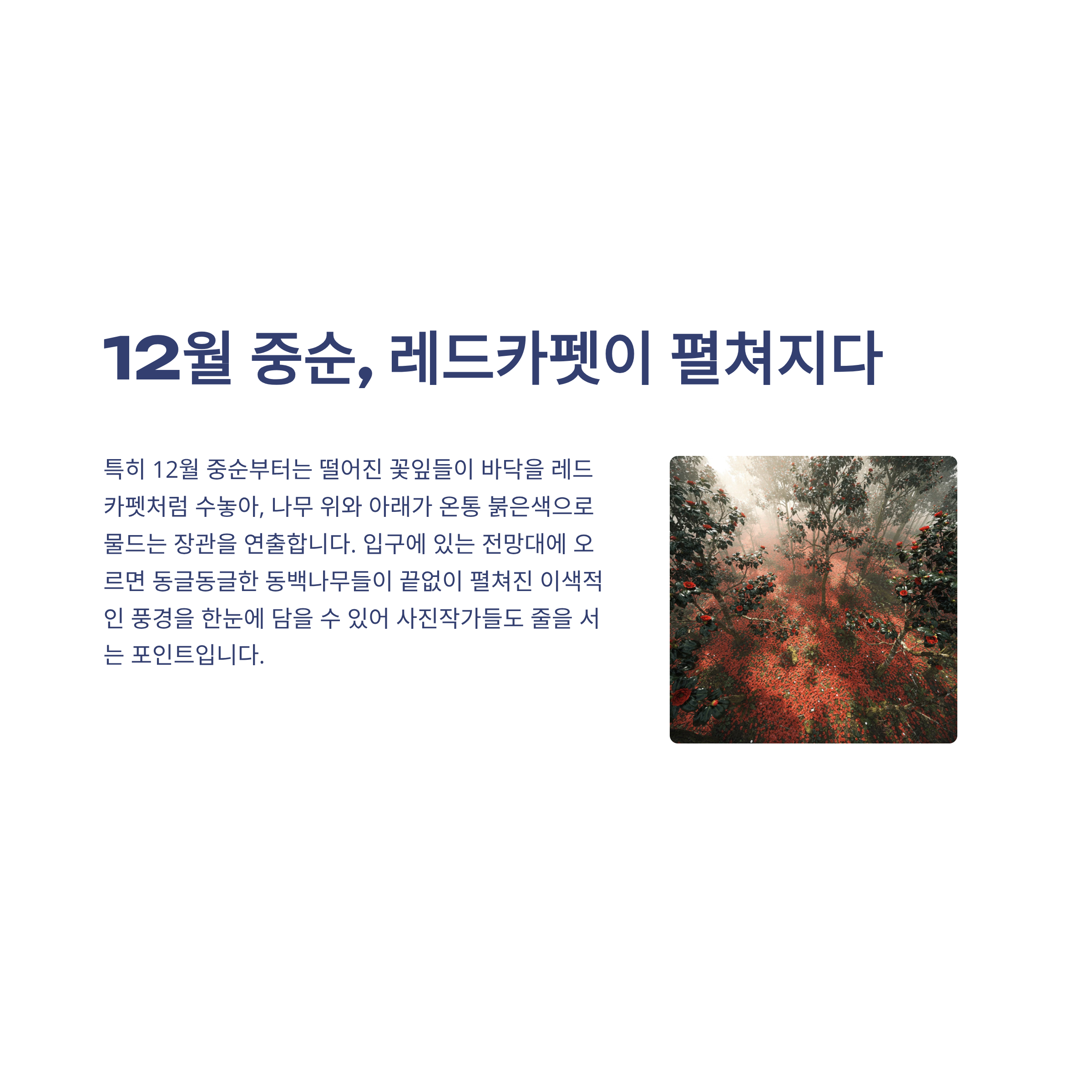특히 12월 중순부터는 떨어진 꽃잎들이 바닥을 레드카펫처럼 수놓아, 나무 위와 아래가 온통 붉은색으로 물드는 장관을 연출합니다. 입구에 있는 전망대에 오르면 동글동글한 동백나무들이 끝없이 펼쳐진 이색적인 풍경을 한눈에 담을 수 있어 사진작가들도 줄을 서는 포인트입니다.