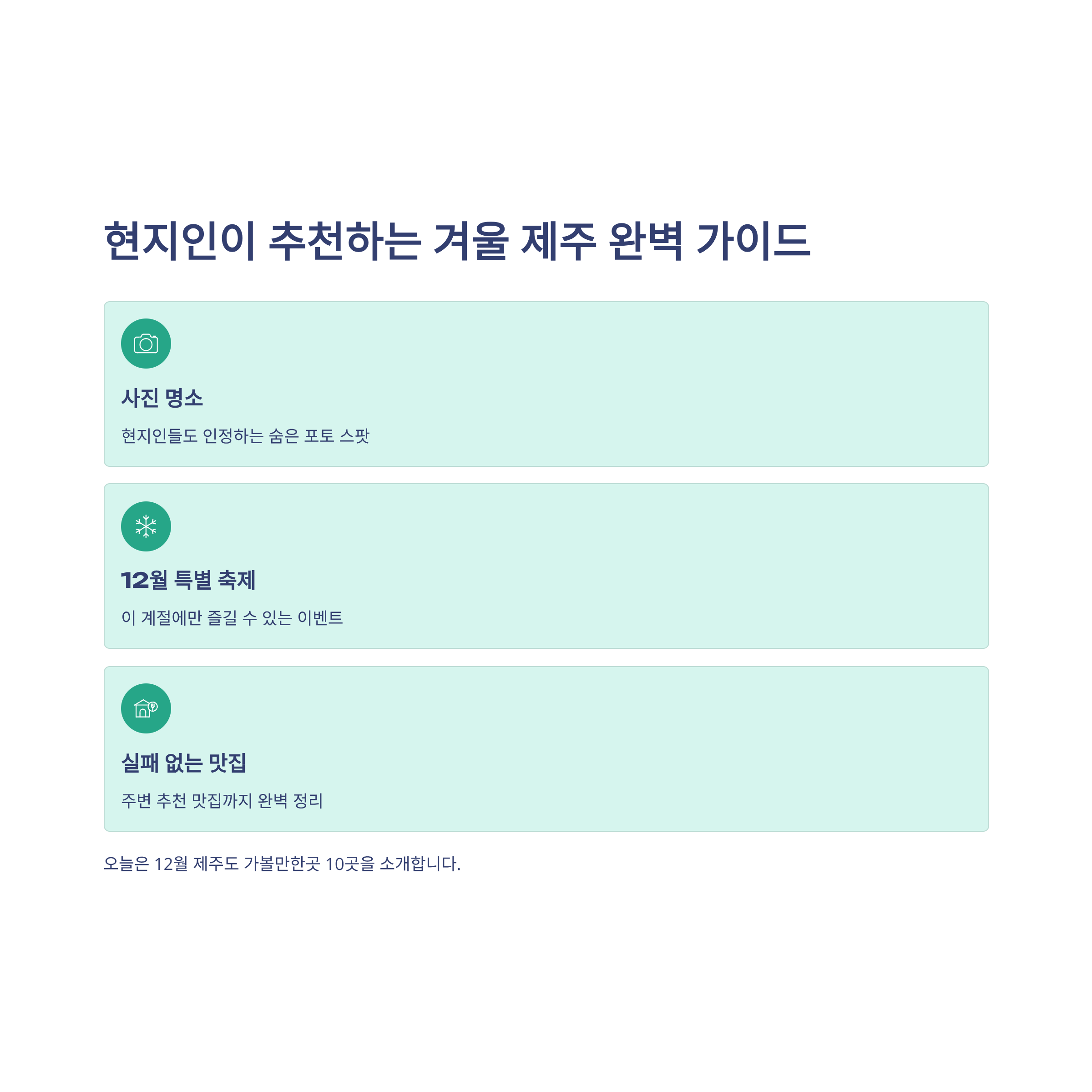 오늘은 현지인들도 인정하는 겨울 제주 여행의 핵심, 사진 찍기 좋은 숨은 명소와 12월에만 즐길 수 있는 특별한 축제 정보, 그리고 실패 없는 주변 맛집까지 꽉 채운 12월 제주도 가볼만한곳 10곳을 소개합니다.