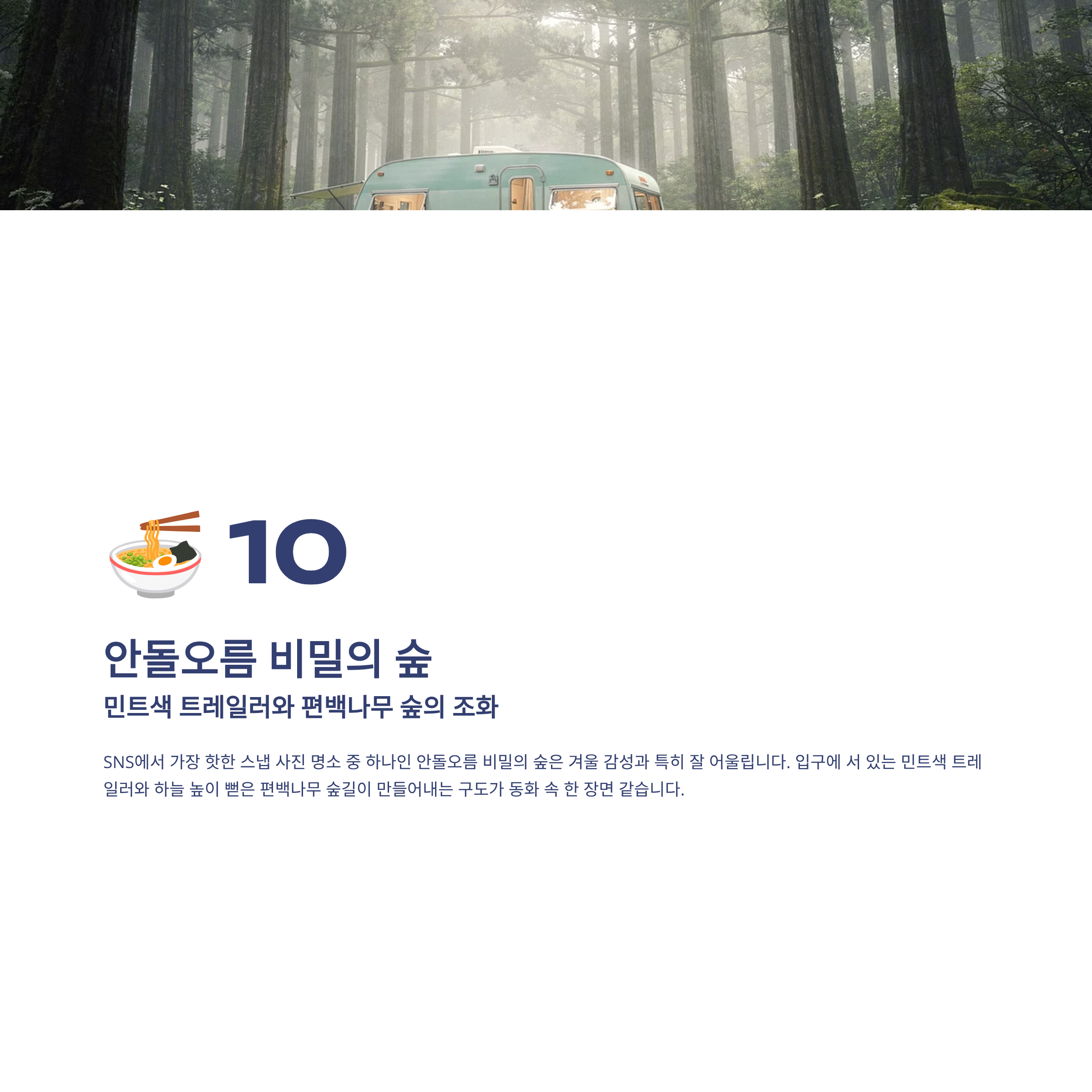 SNS에서 가장 핫한 스냅 사진 명소 중 하나인 안돌오름 비밀의 숲은 겨울 감성과 특히 잘 어울립니다. 입구에 서 있는 민트색 트레일러와 하늘 높이 뻗은 편백나무 숲길이 만들어내는 구도가 동화 속 한 장면 같습니다.