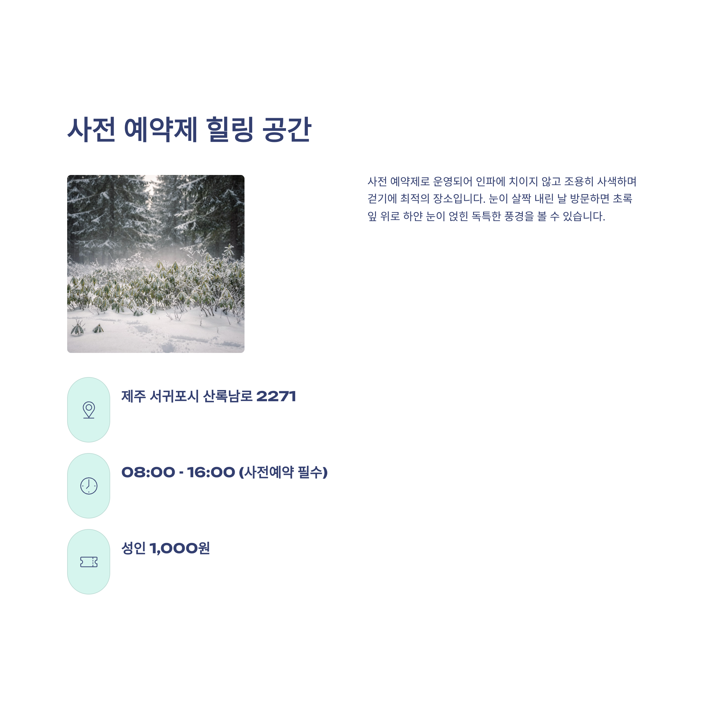 사전 예약제로 운영되어 인파에 치이지 않고 조용히 사색하며 걷기에 최적의 장소입니다. 눈이 살짝 내린 날 방문하면 초록 잎 위로 하얀 눈이 얹힌 독특한 풍경을 볼 수 있습니다.