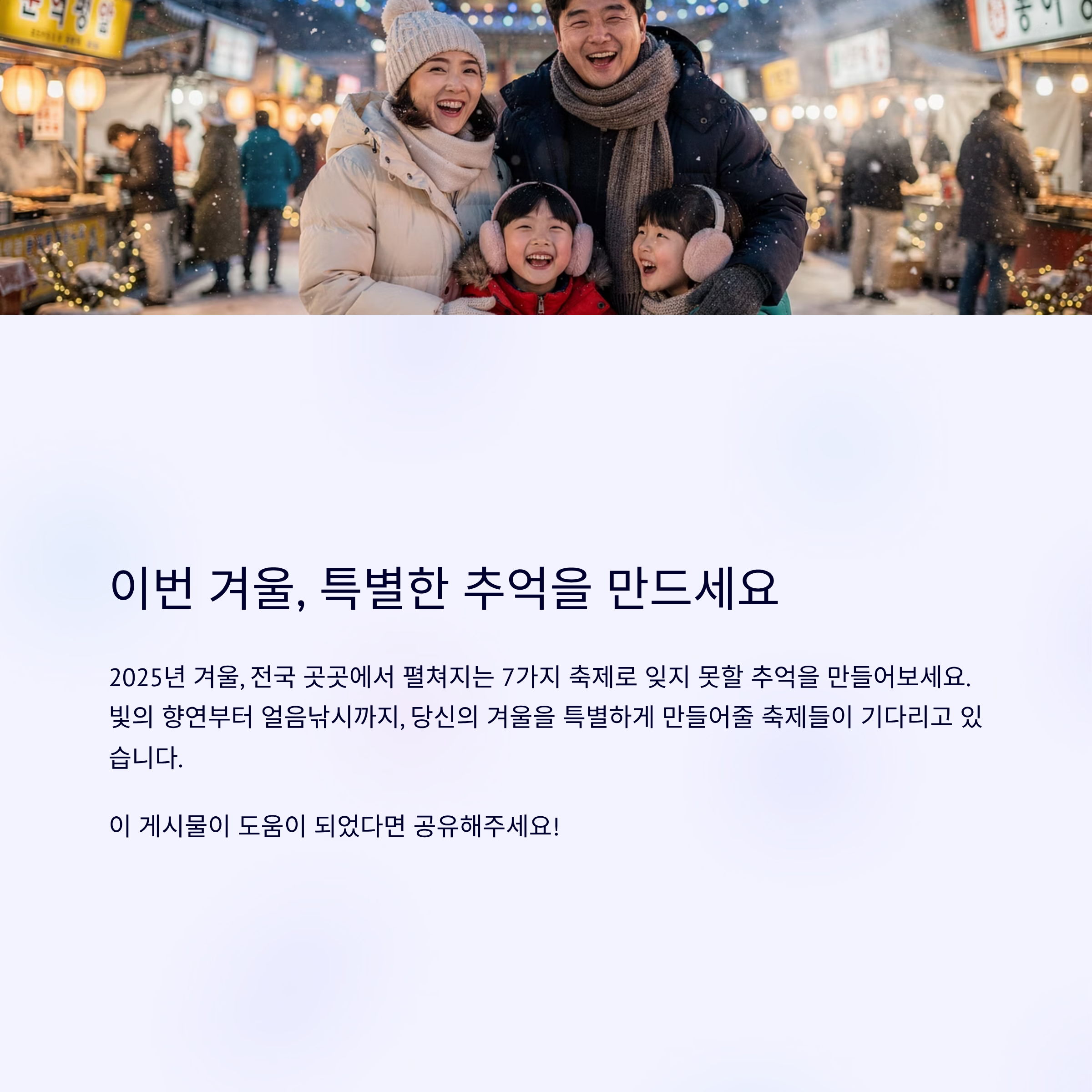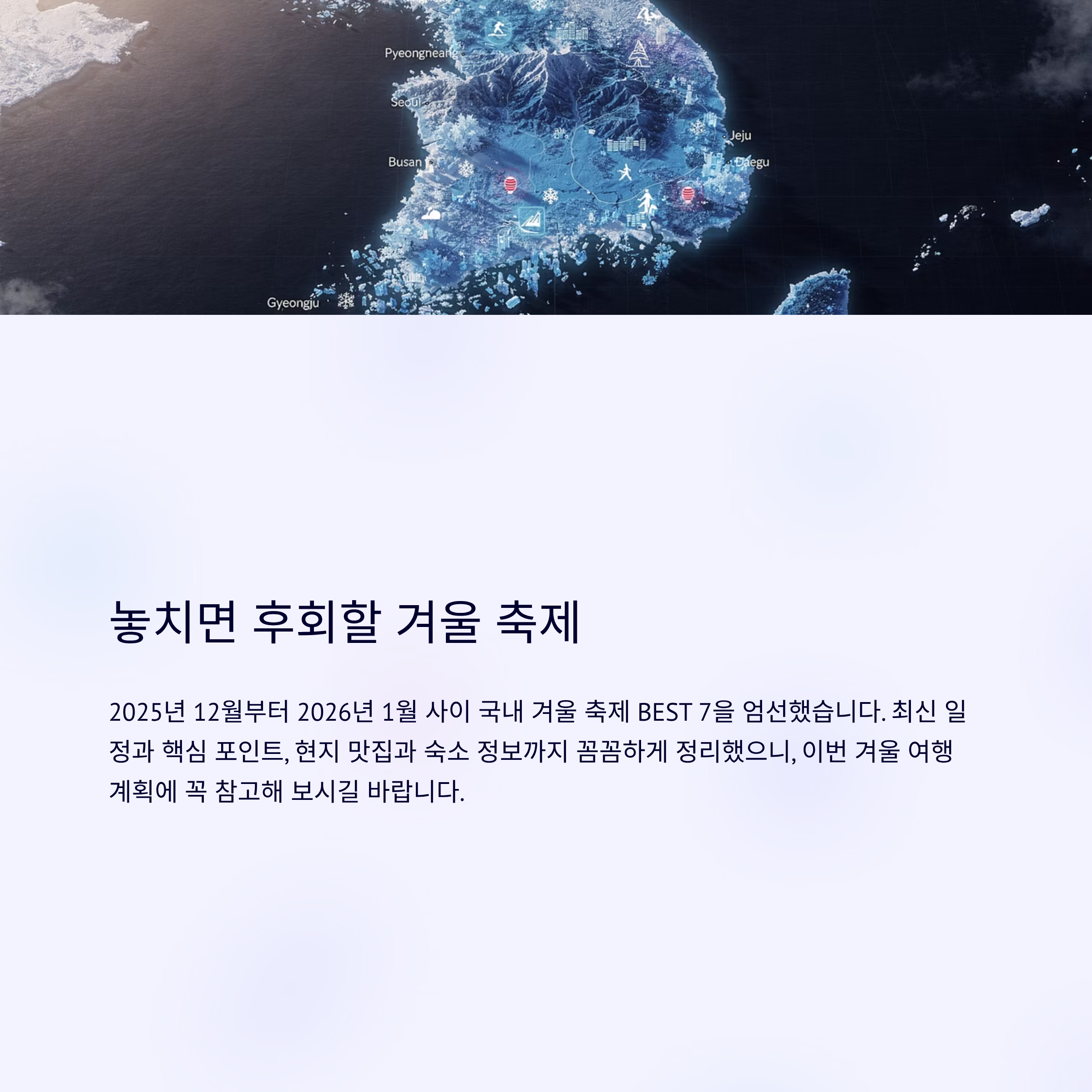 오늘은 2025년 12월부터 2026년 1월 사이 놓치면 후회할 국내 겨울 축제 BEST 7을 엄선했습니다. 최신 일정과 핵심 포인트, 현지 맛집과 숙소 정보까지 꼼꼼하게 정리했으니, 이번 겨울 여행 계획에 꼭 참고해 보시길 바랍니다.
