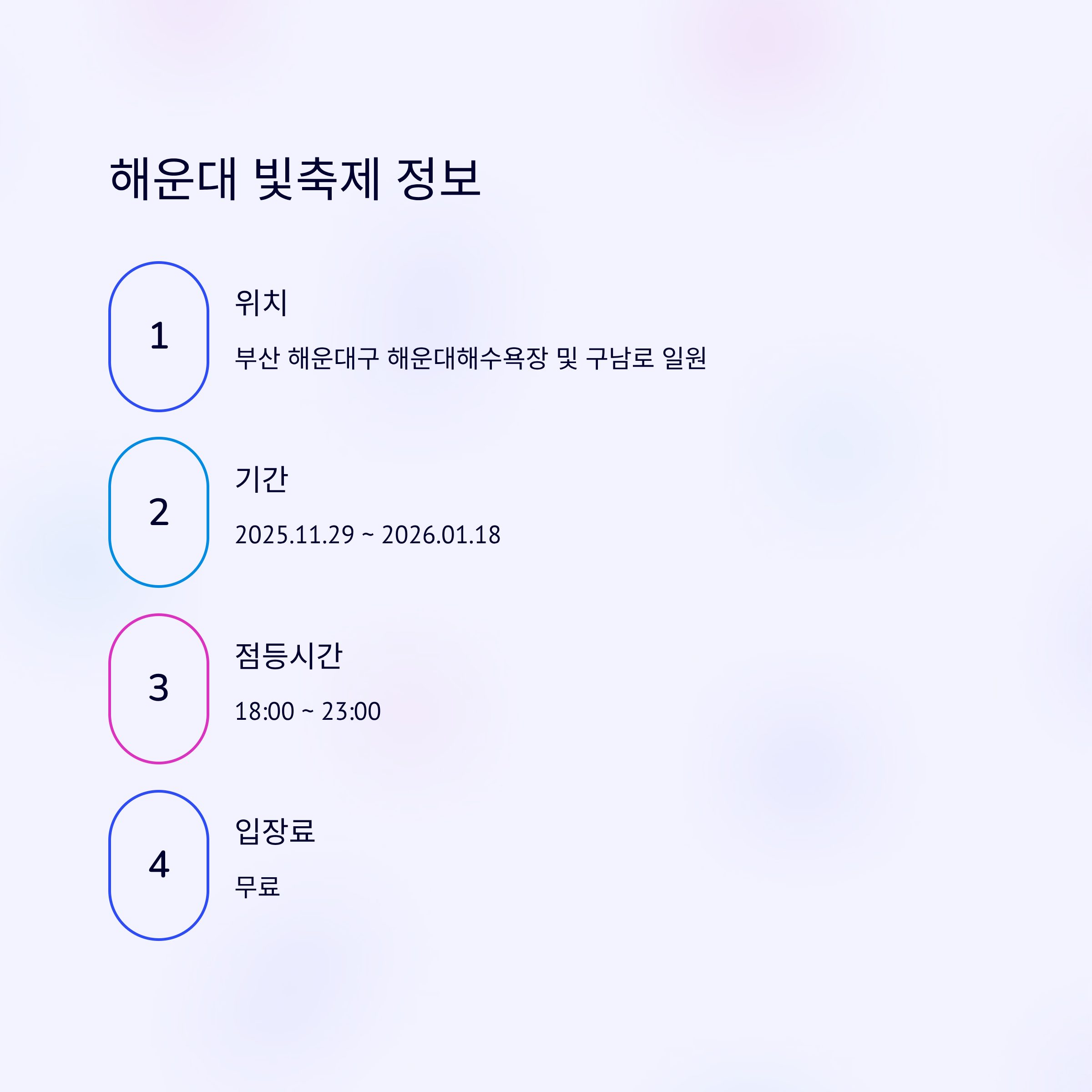 올해는 구남로 광장부터 해수욕장까지 이어지는 구간이 더욱 화려해졌으며, 불꽃쇼와 미디어아트가 업그레이드되었습니다. 11월 말부터 시작해 내년 1월 중순까지 넉넉하게 즐길 수 있습니다.