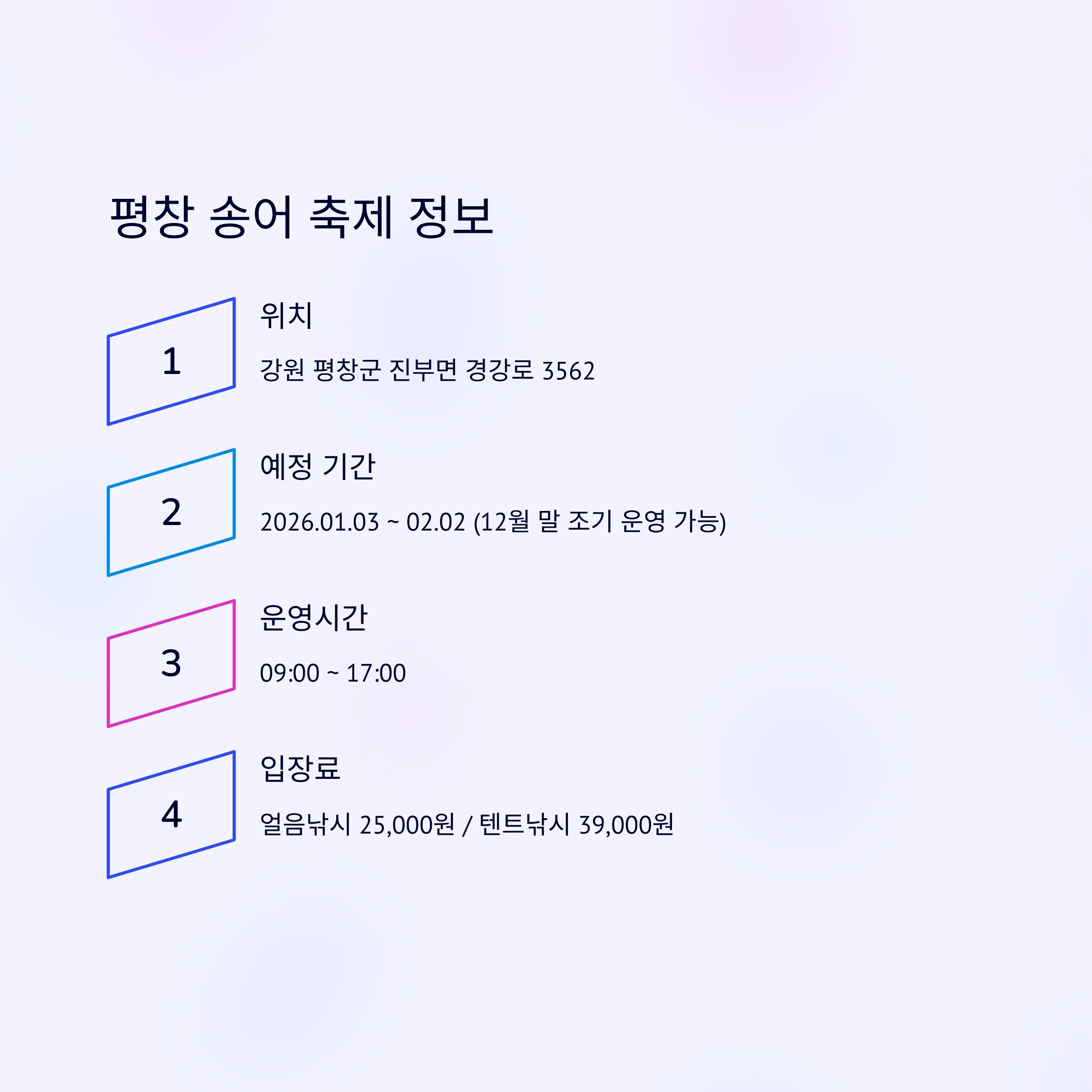 얼음낚시의 원조, 평창 송어 축제는 2026년 1월 3일 개막 예정이지만, 12월 27일부터 텐트 낚시 등 일부 프로그램이 조기 운영될 가능성이 있습니다. 기상 상황에 따라 변동이 잦으니 방문 전 홈페이지 확인이 필수입니다.