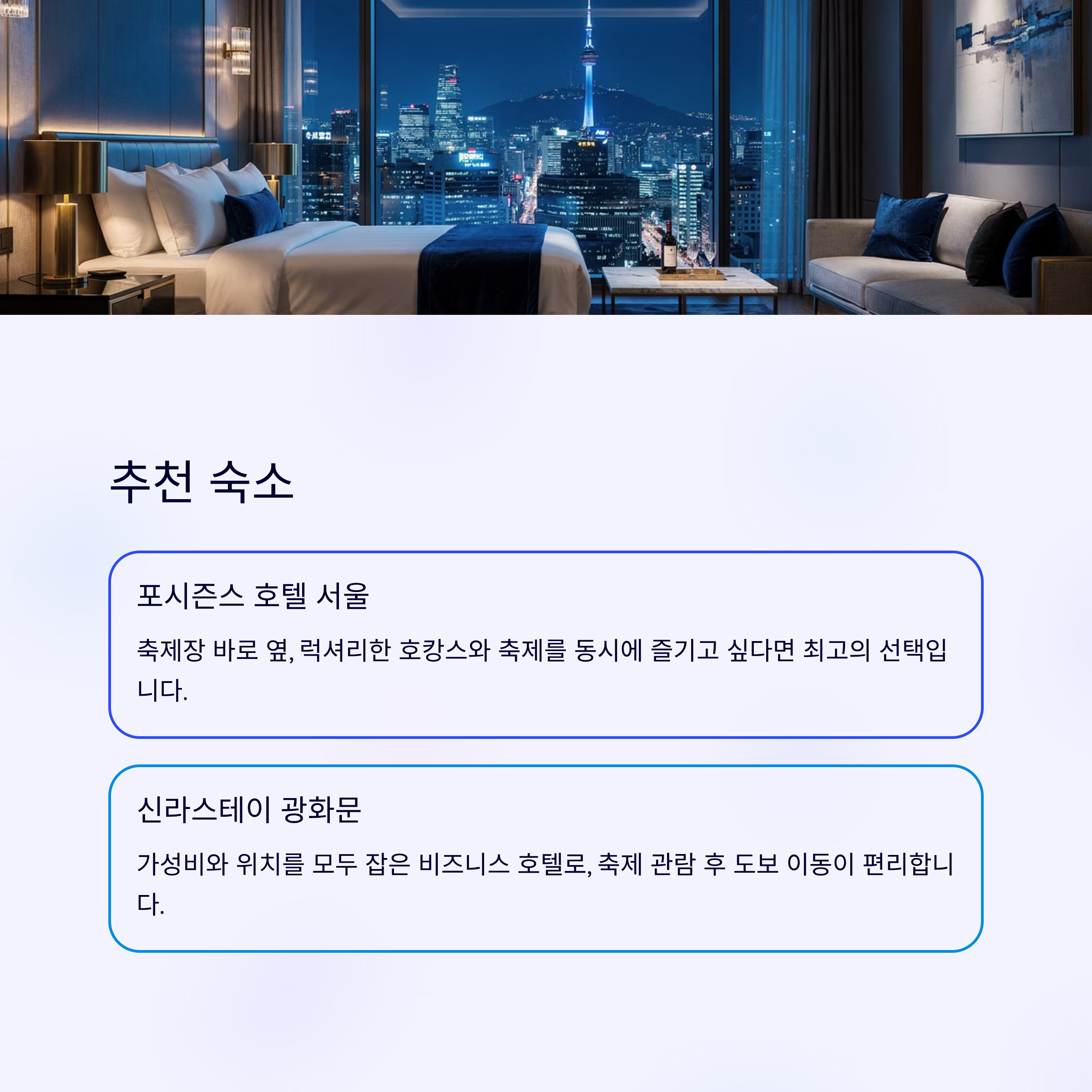 신라스테이 광화문: 가성비와 위치를 모두 잡은 비즈니스 호텔로, 축제 관람 후 도보 이동이 편리합니다.