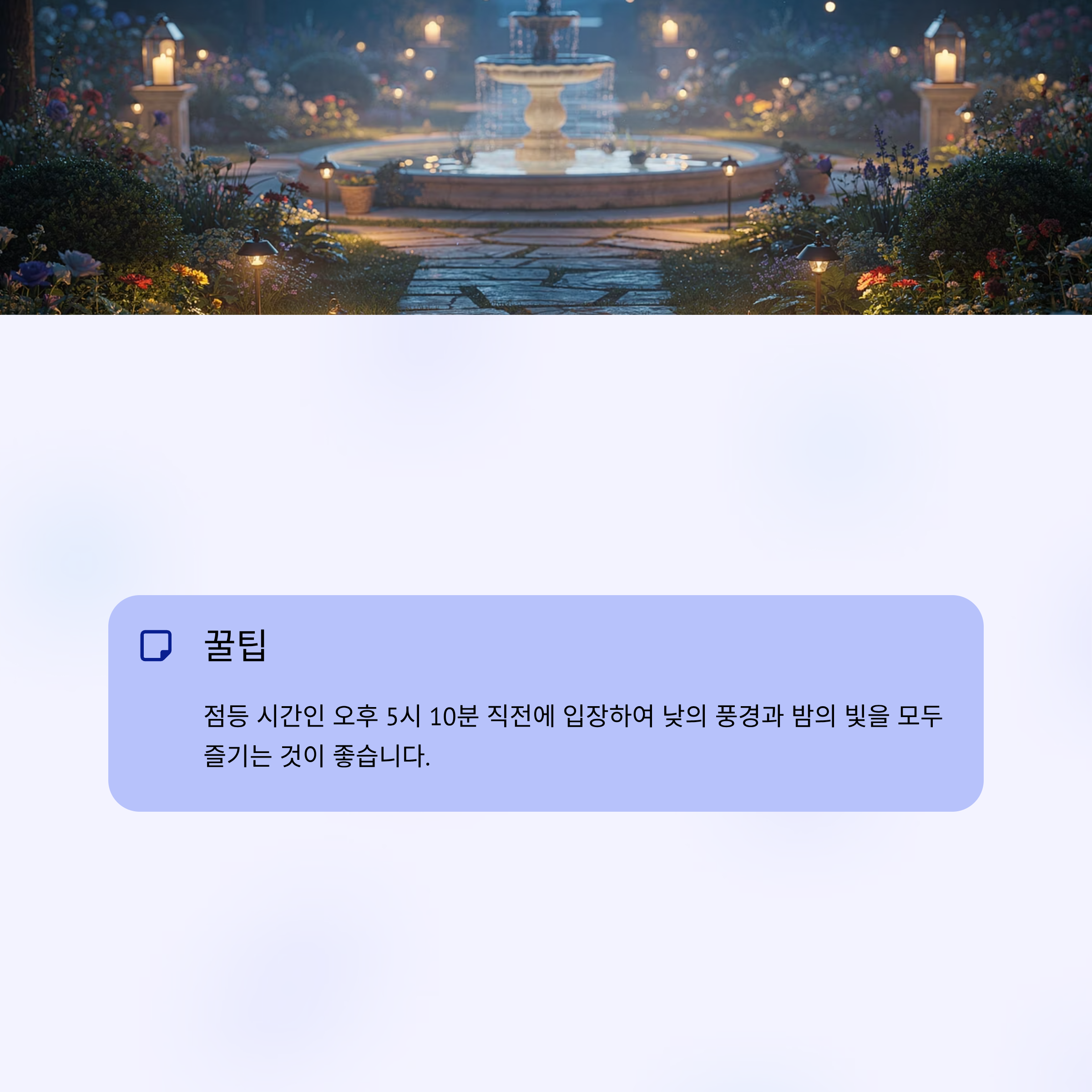 ✔ 꿀팁: 점등 시간인 오후 5시 10분 직전에 입장하여 낮의 풍경과 밤의 빛을 모두 즐기는 것이 좋습니다.