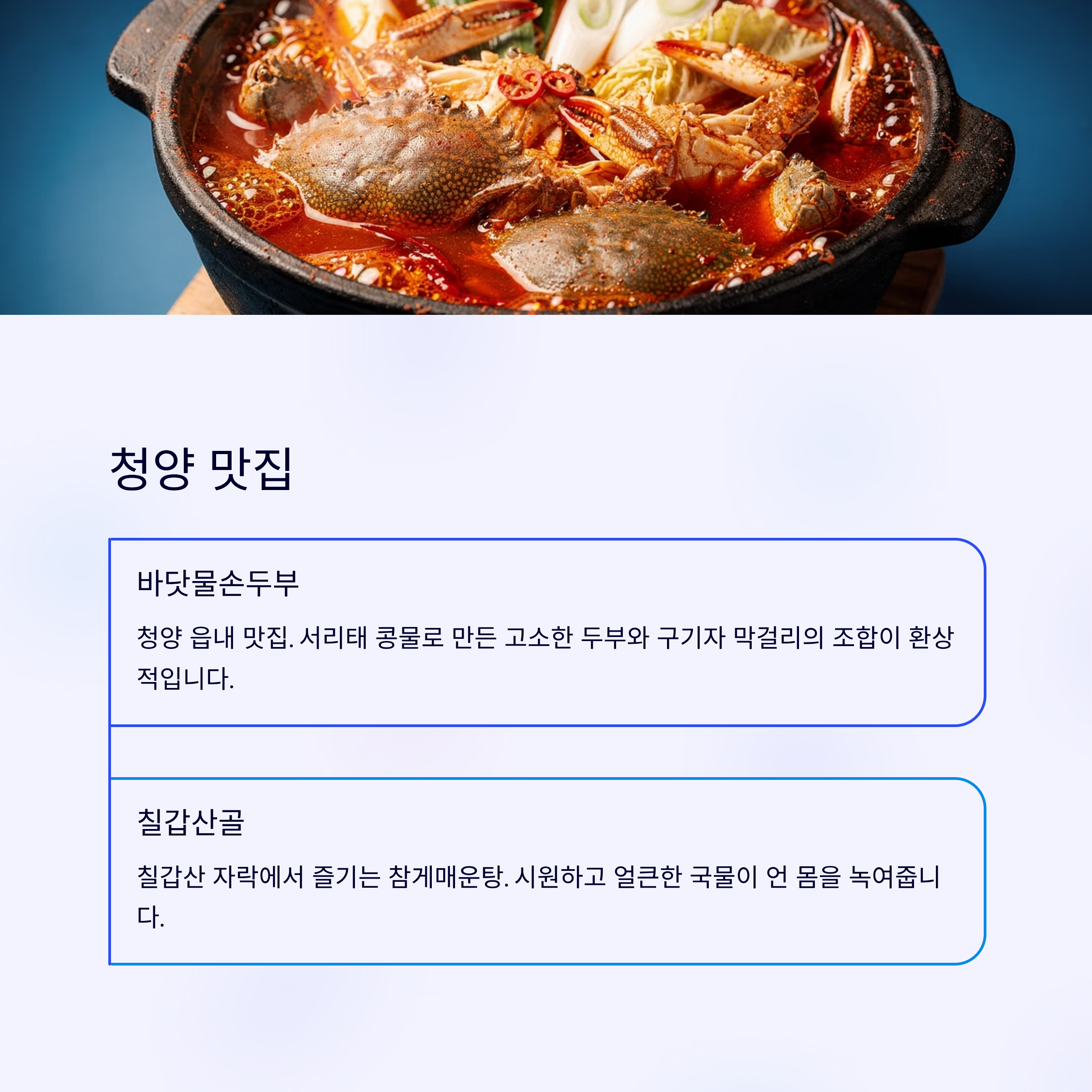 바닷물손두부: 청양 읍내 맛집. 서리태 콩물로 만든 고소한 두부와 구기자 막걸리의 조합이 환상적입니다.