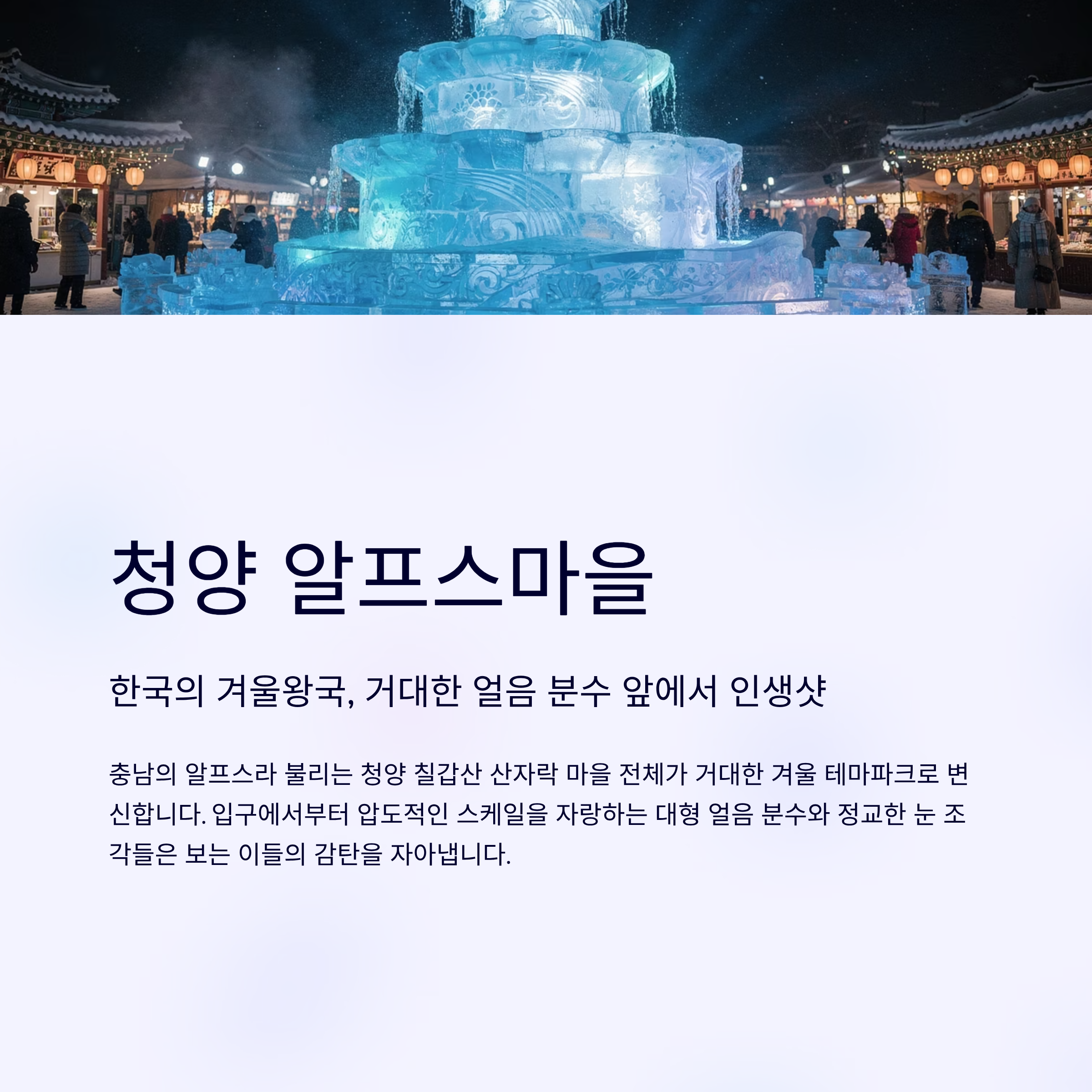 충남의 알프스라 불리는 청양 칠갑산 산자락 마을 전체가 거대한 겨울 테마파크로 변신합니다. 입구에서부터 압도적인 스케일을 자랑하는 대형 얼음 분수와 정교한 눈 조각들은 보는 이들의 감탄을 자아냅니다.