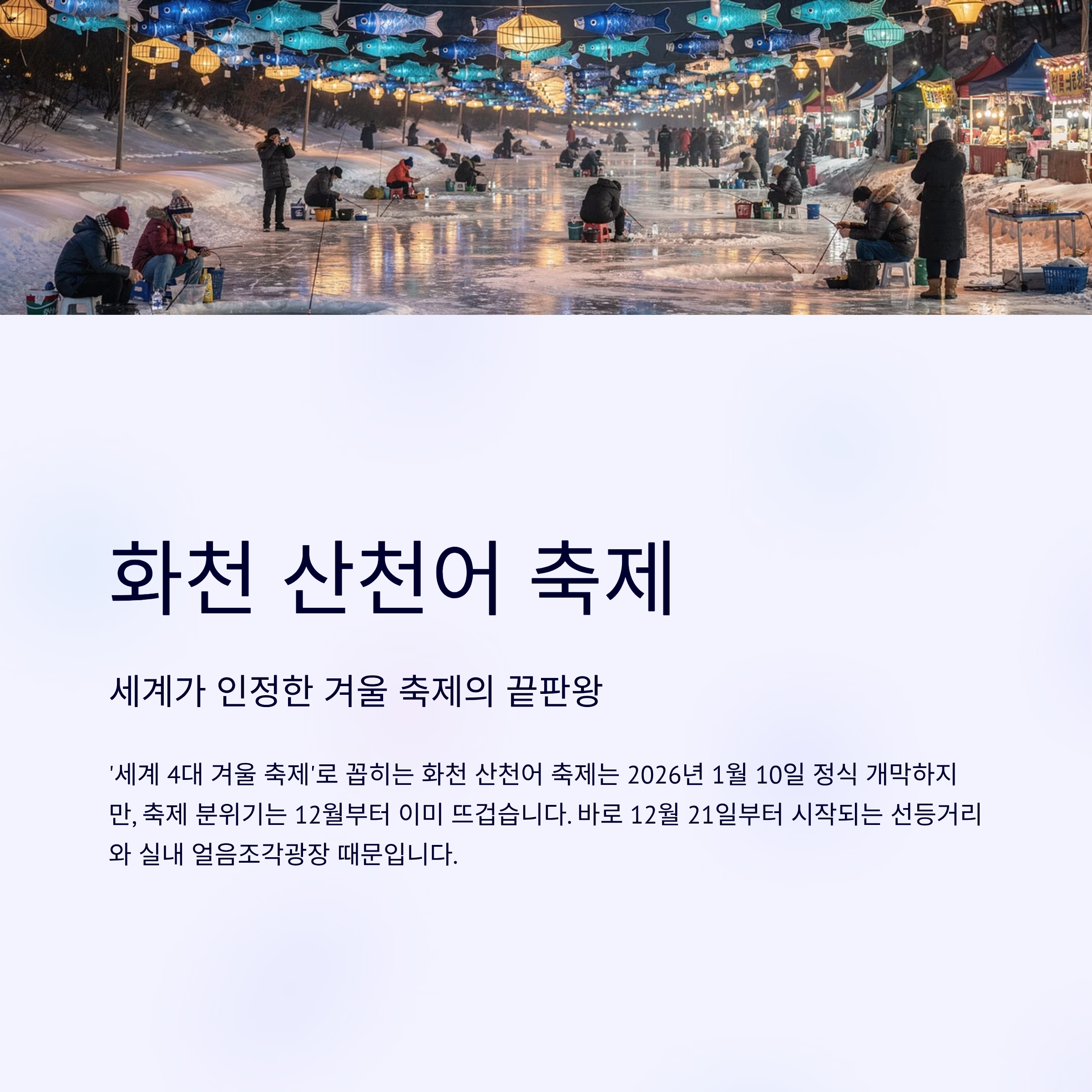 12월은 매서운 추위마저 낭만이 되는 계절입니다. 한 해를 마무리하는 이 시기, 전국 곳곳에서는 차가운 밤을 화려하게 수놓는 빛 축제부터 얼음 위에서 즐기는 짜릿한 손맛까지, 다채로운 겨울 축제들이 여행자들을 기다리고 있습니다.