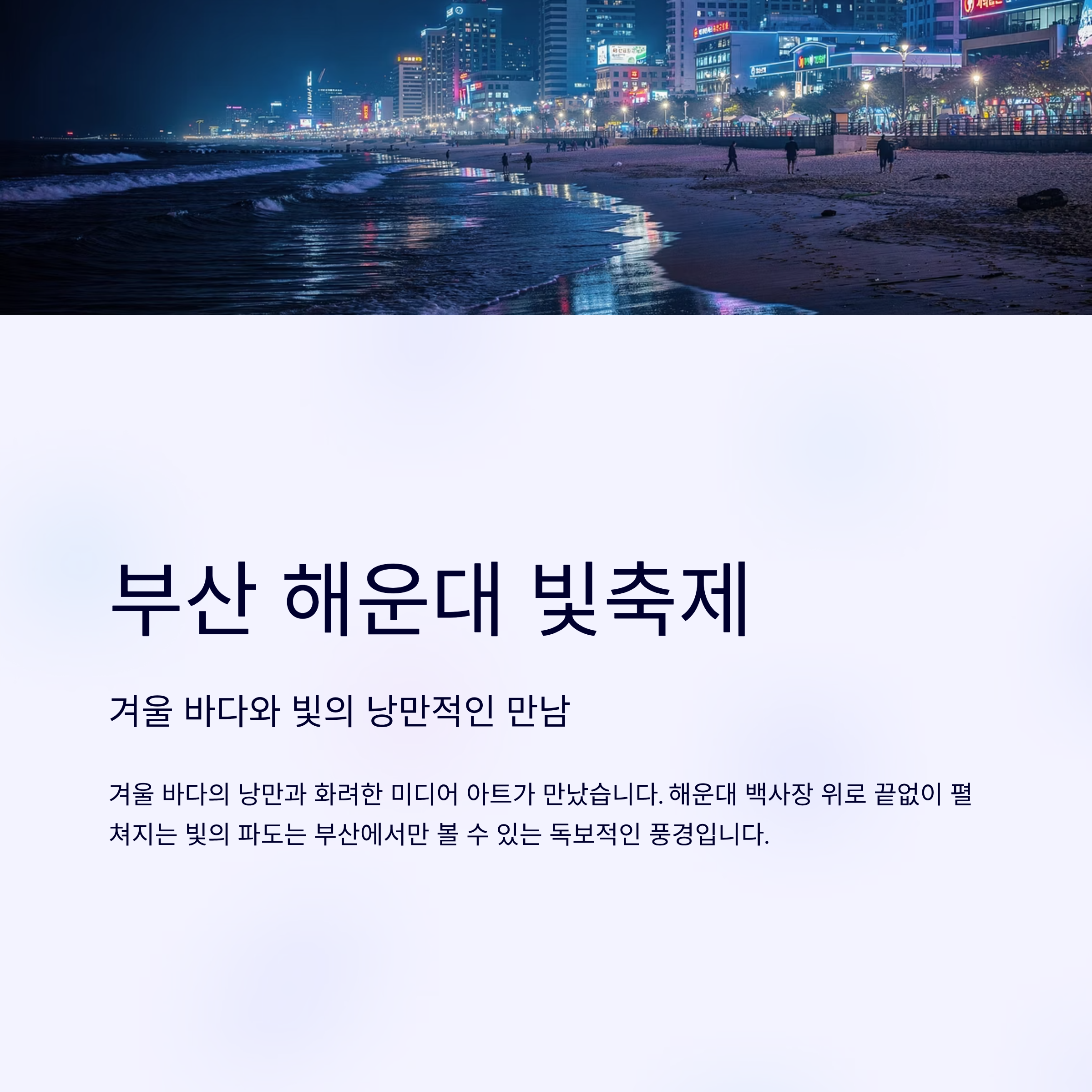 겨울 바다의 낭만과 화려한 미디어 아트가 만났습니다. 해운대 백사장 위로 끝없이 펼쳐지는 빛의 파도는 부산에서만 볼 수 있는 독보적인 풍경입니다.