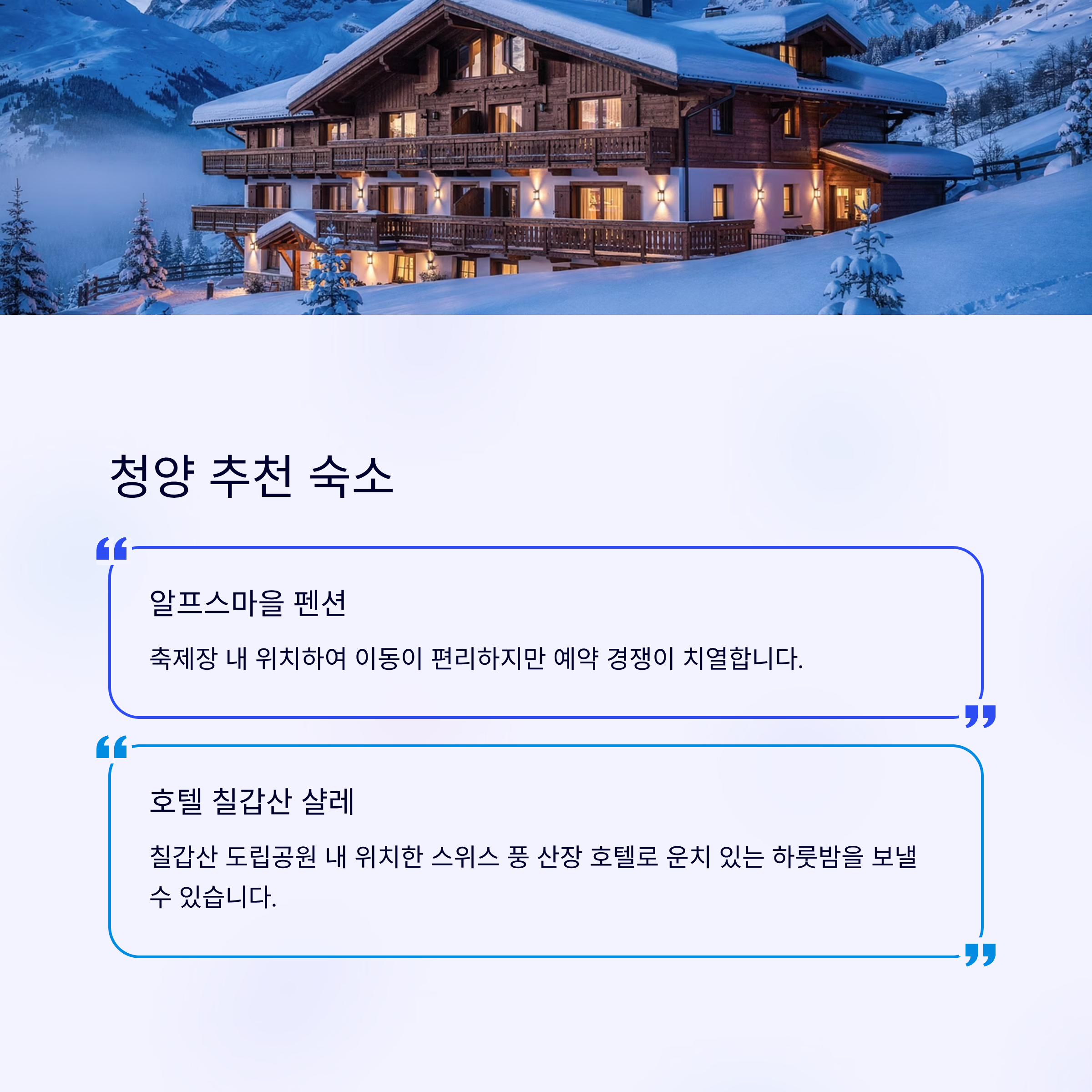 알프스마을 펜션: 축제장 내 위치하여 이동이 편리하지만 예약 경쟁이 치열합니다.