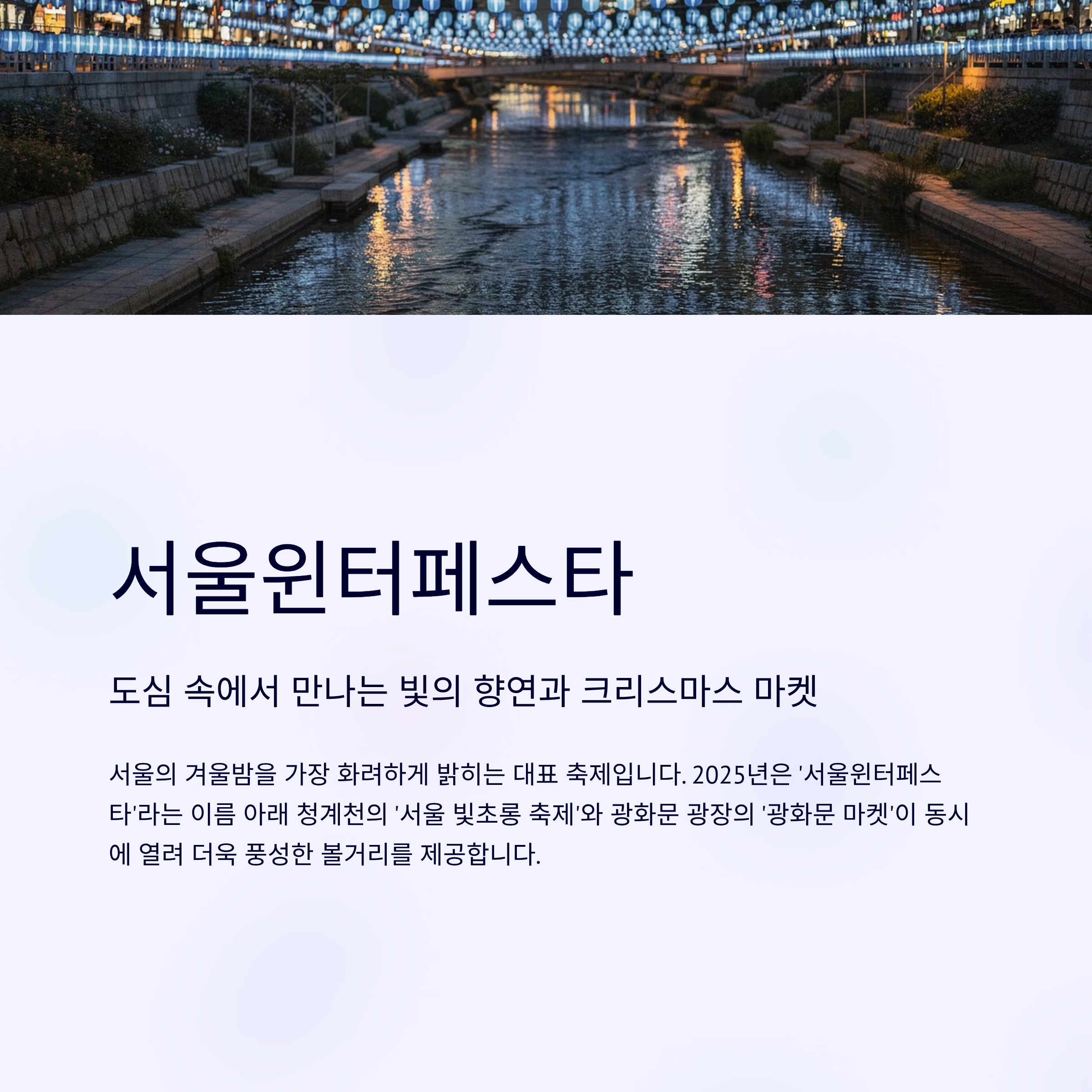 서울의 겨울밤을 가장 화려하게 밝히는 대표 축제입니다. 2025년은 '서울윈터페스타'라는 이름 아래 청계천의 '서울 빛초롱 축제'와 광화문 광장의 '광화문 마켓'이 동시에 열려 더욱 풍성한 볼거리를 제공합니다.