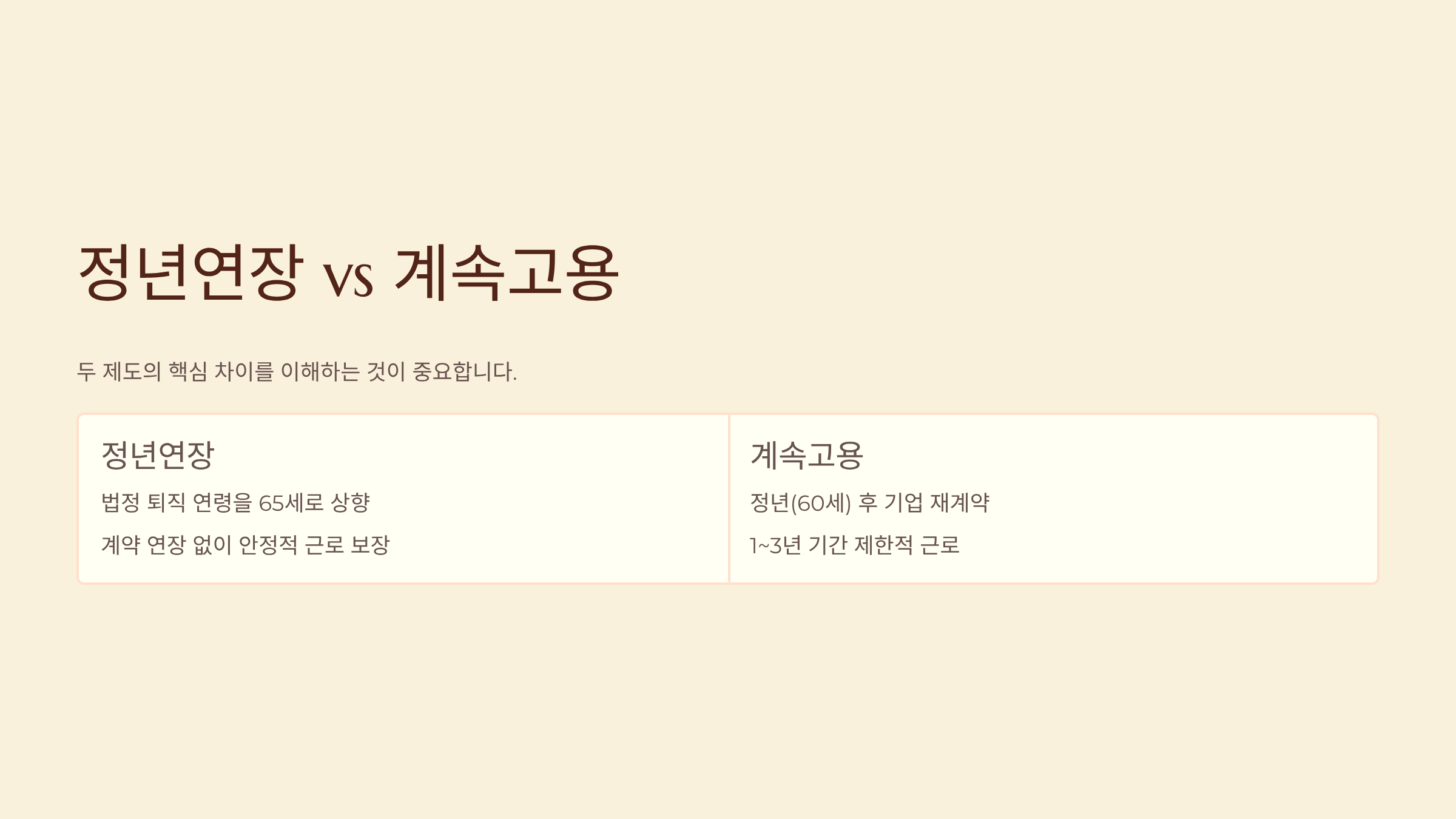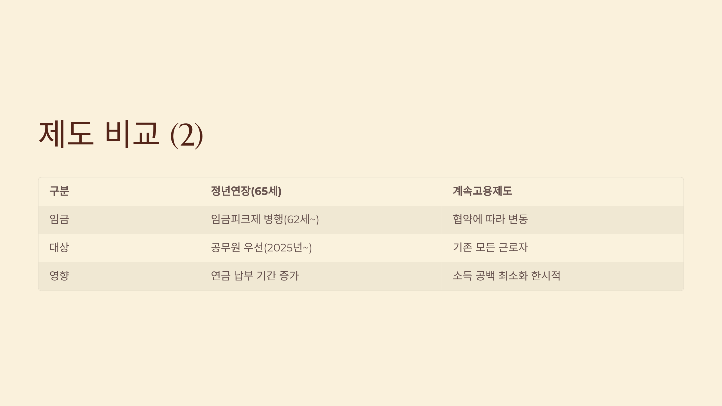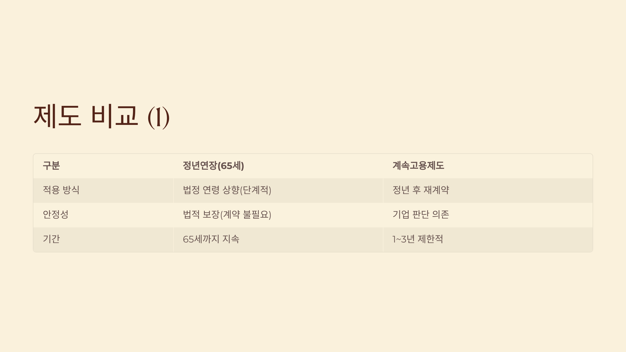 - 구분: 기간, 정년연장(65세): 65세까지 지속, 계속 고용제도: 1~3년 제한적