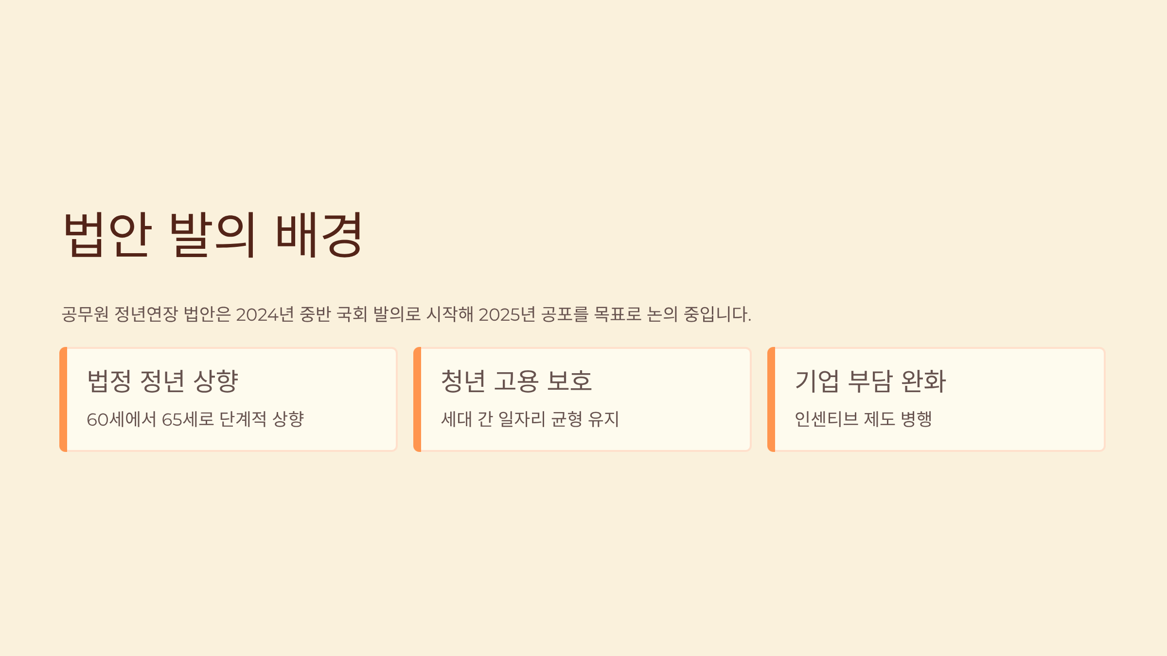 공무원 정년연장 법안은 2024년 중반 국회 발의로 시작해 2025년 공포를 목표로 논의 중입니다.