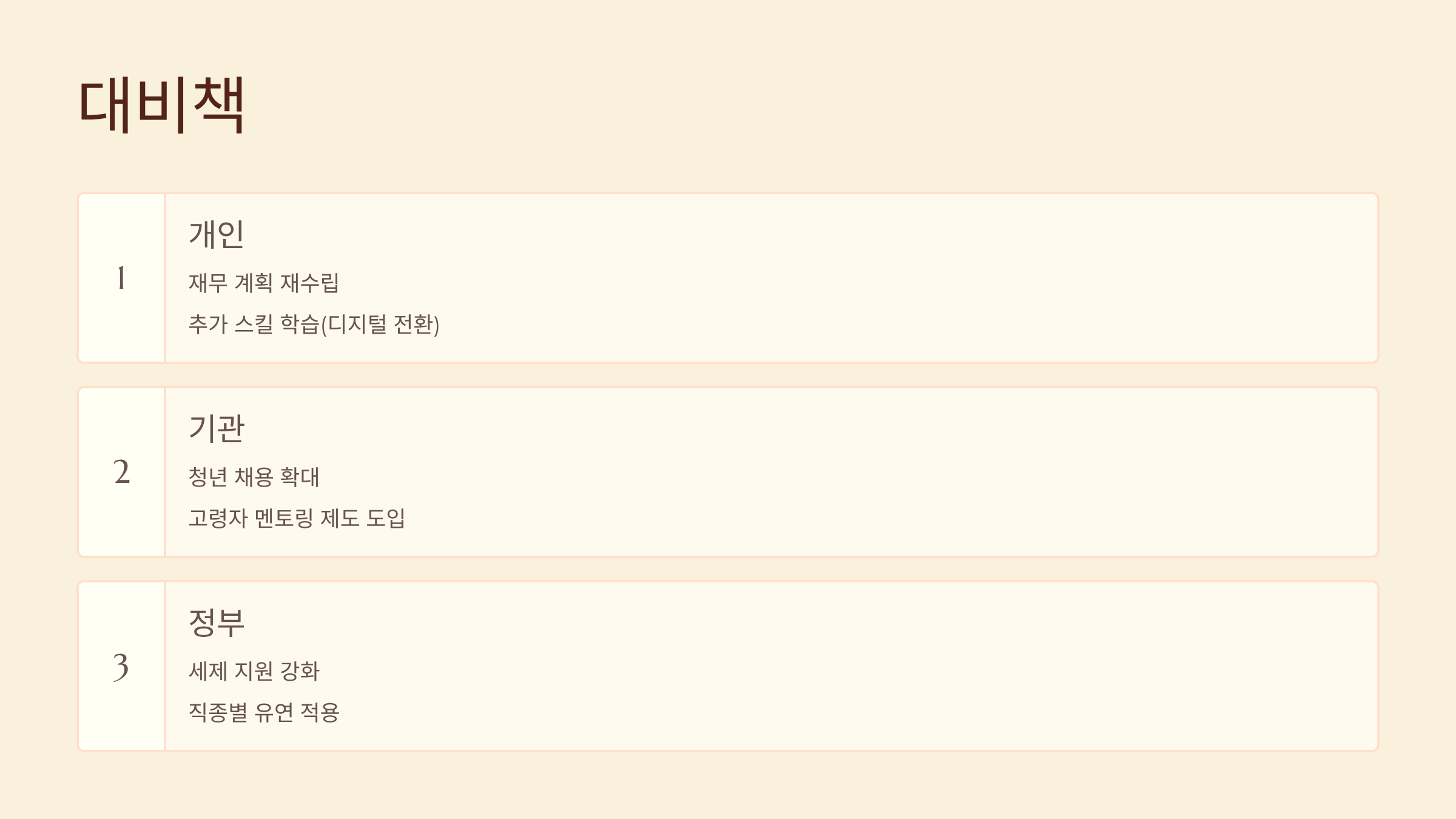 - 개인: 재무 계획 재수립, 추가 스킬 학습(디지털 전환)