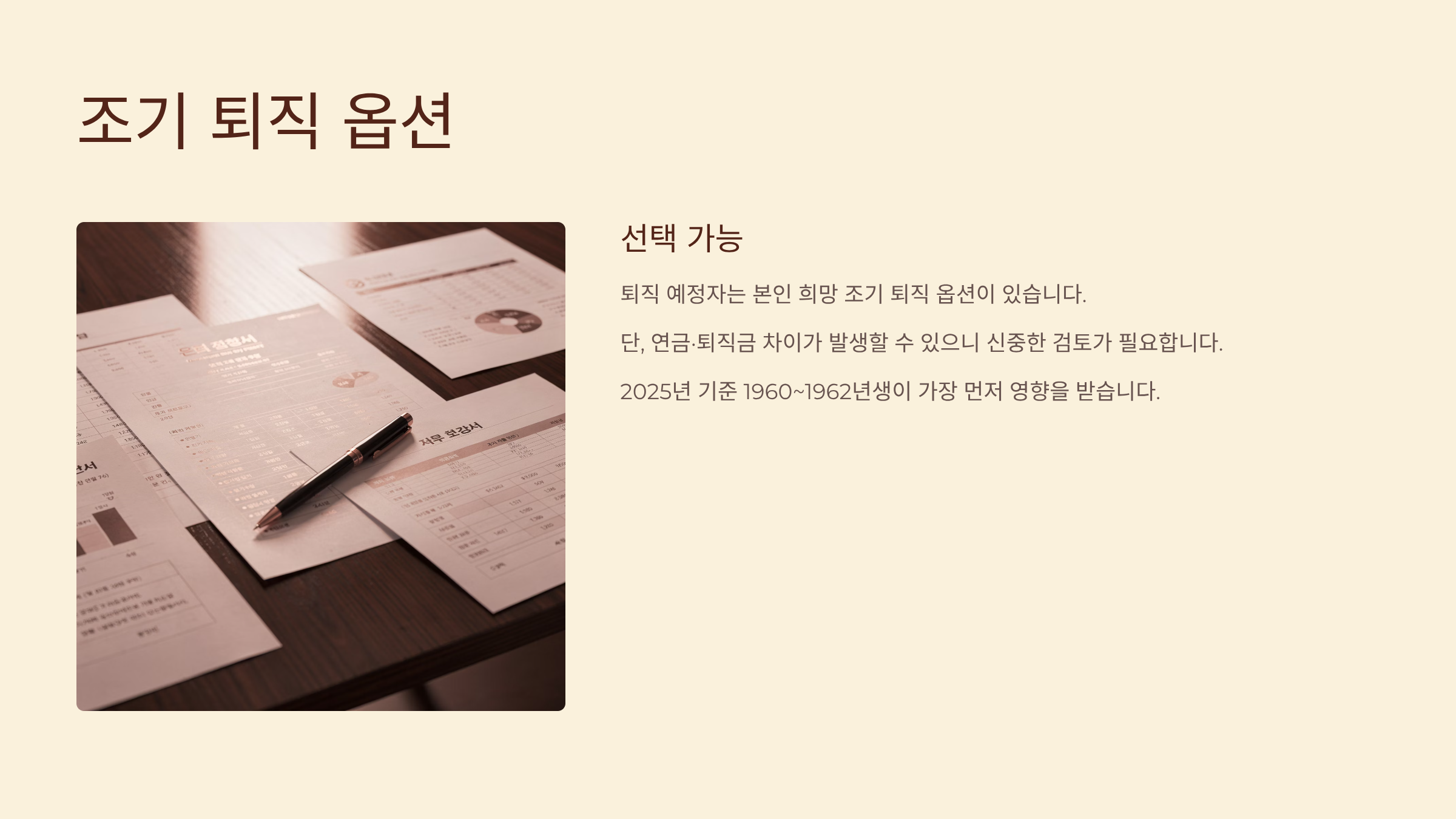 퇴직 예정자라면 본인 희망 조기 퇴직 옵션이 있지만, 연금·퇴직금 차이가 발생할 수 있습니다. 2025년 기준 1960~1962년생이 가장 먼저 영향을 받으니 노후 계획 재검토가 필요합니다.