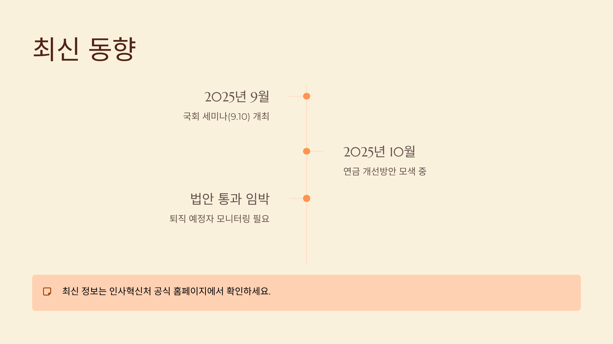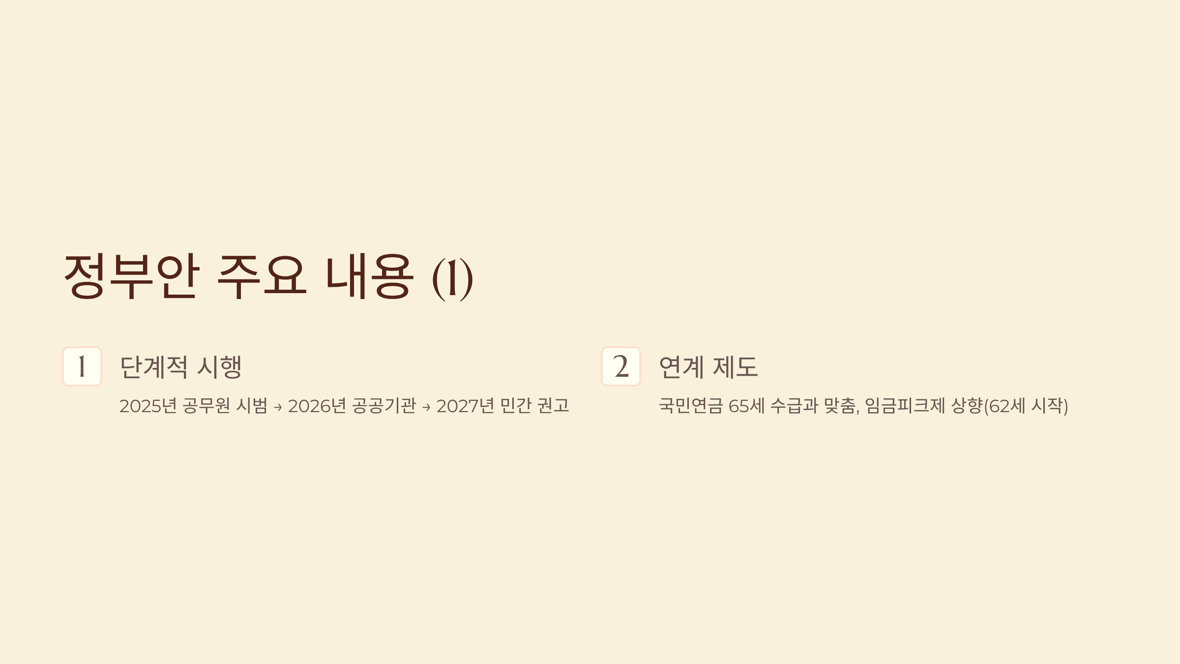 - 연계 제도: 국민연금 65세 수급과 맞춤, 임금피크제 상향(62세 시작)