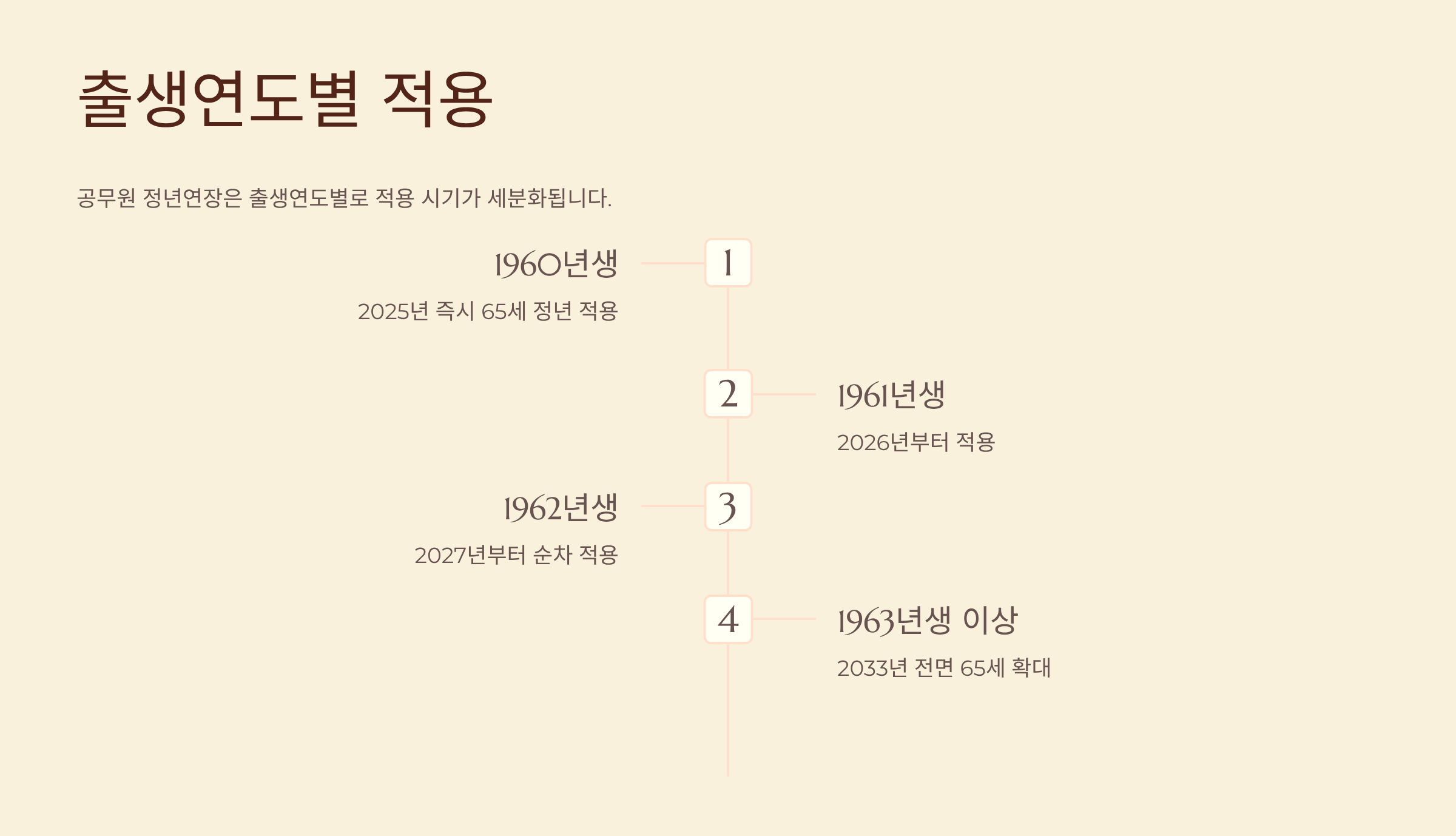 공무원 정년연장은 출생연도별로 적용 시기가 세분화됩니다. 1960년생은 2025년 즉시 65세 정년 적용, 1961년생은 2026년, 1962년생은 2027년부터 순차 적용됩니다. 1963년생 이상은 입사 시점부터 단계적 상향을 거쳐 2033년 전면 65세로 확대됩니다.
